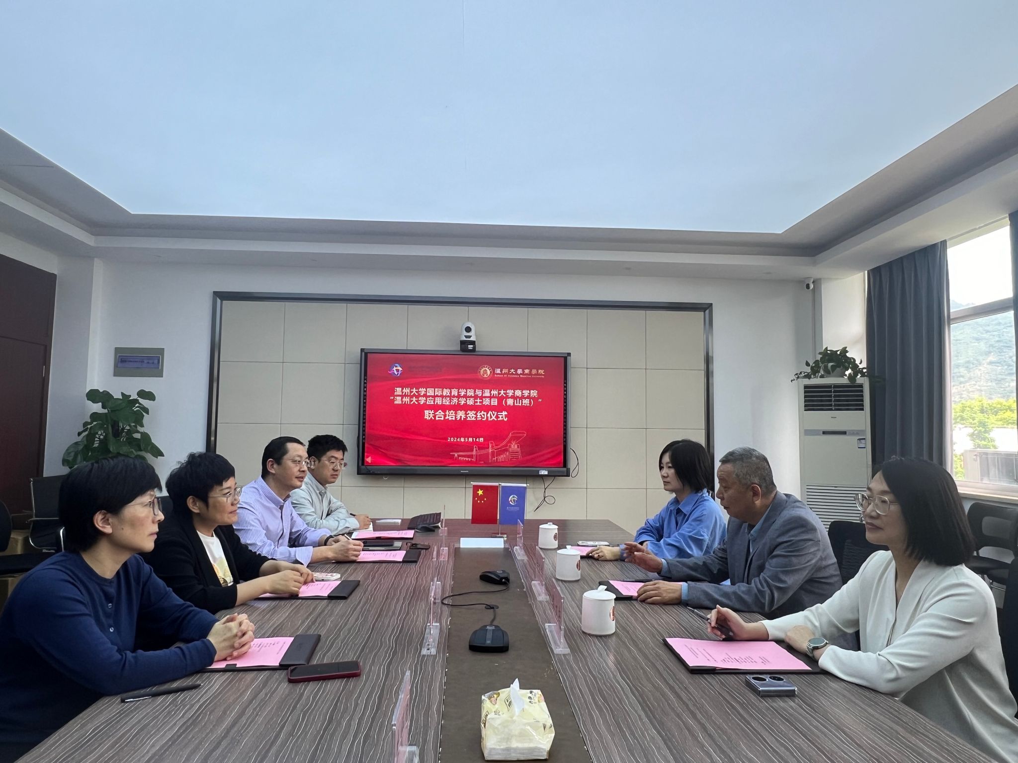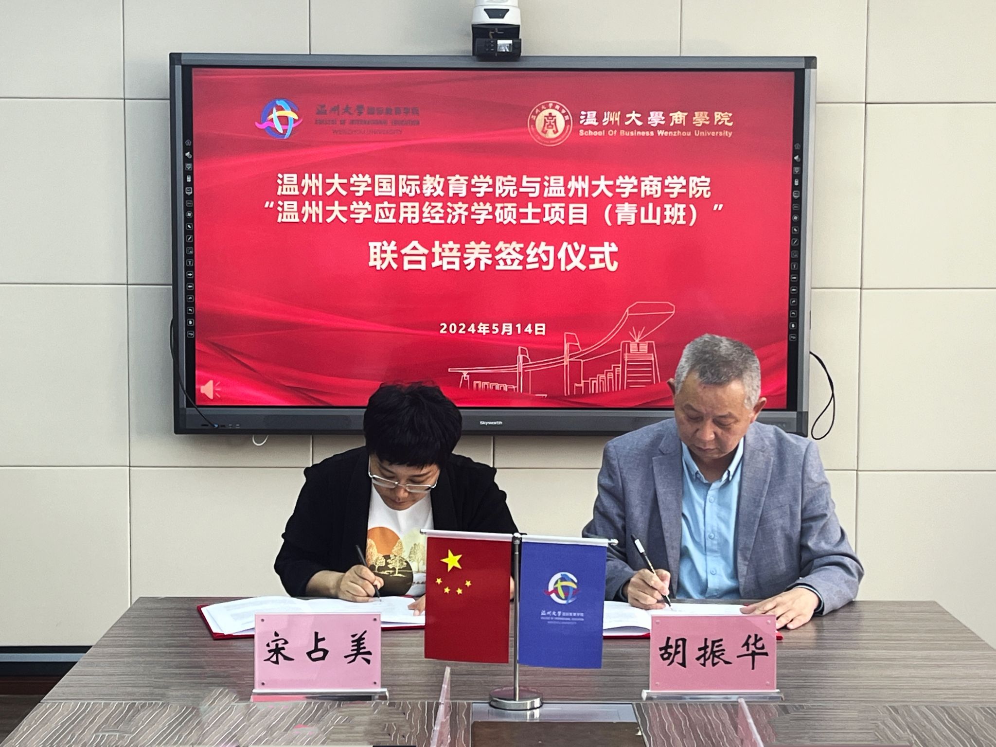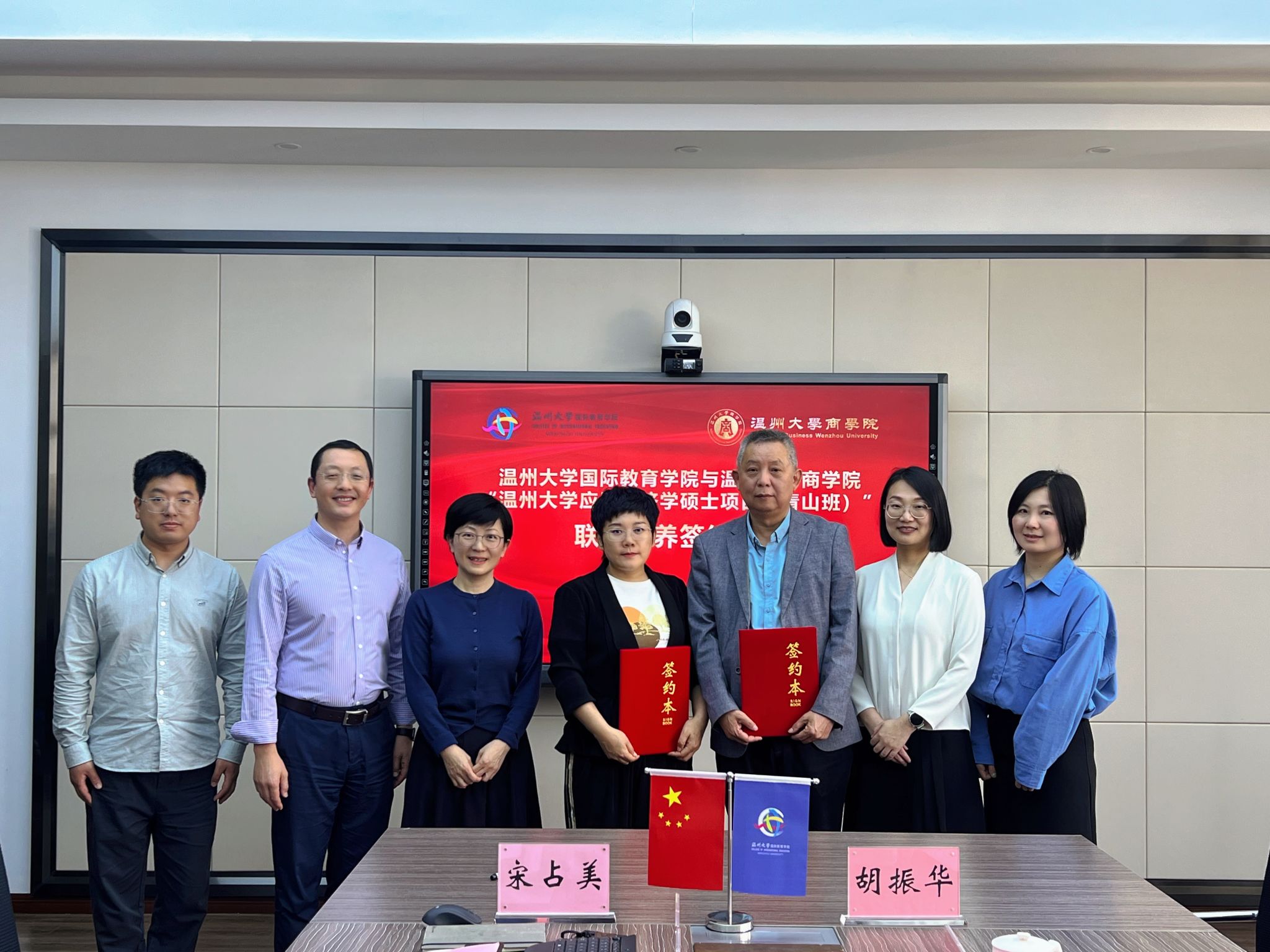 311会议室举行“温州大学应用经济学硕士项目(青山班)”联合培养项目签约仪式。参加活动的有商学院院长胡振华、副院长陈文芝与商学院国际学生硕士点负责人王露。国际学院院长宋占美、党总支书记林爱菊、副院长熊勇以及相关科室负责人参加此次签约仪式。
