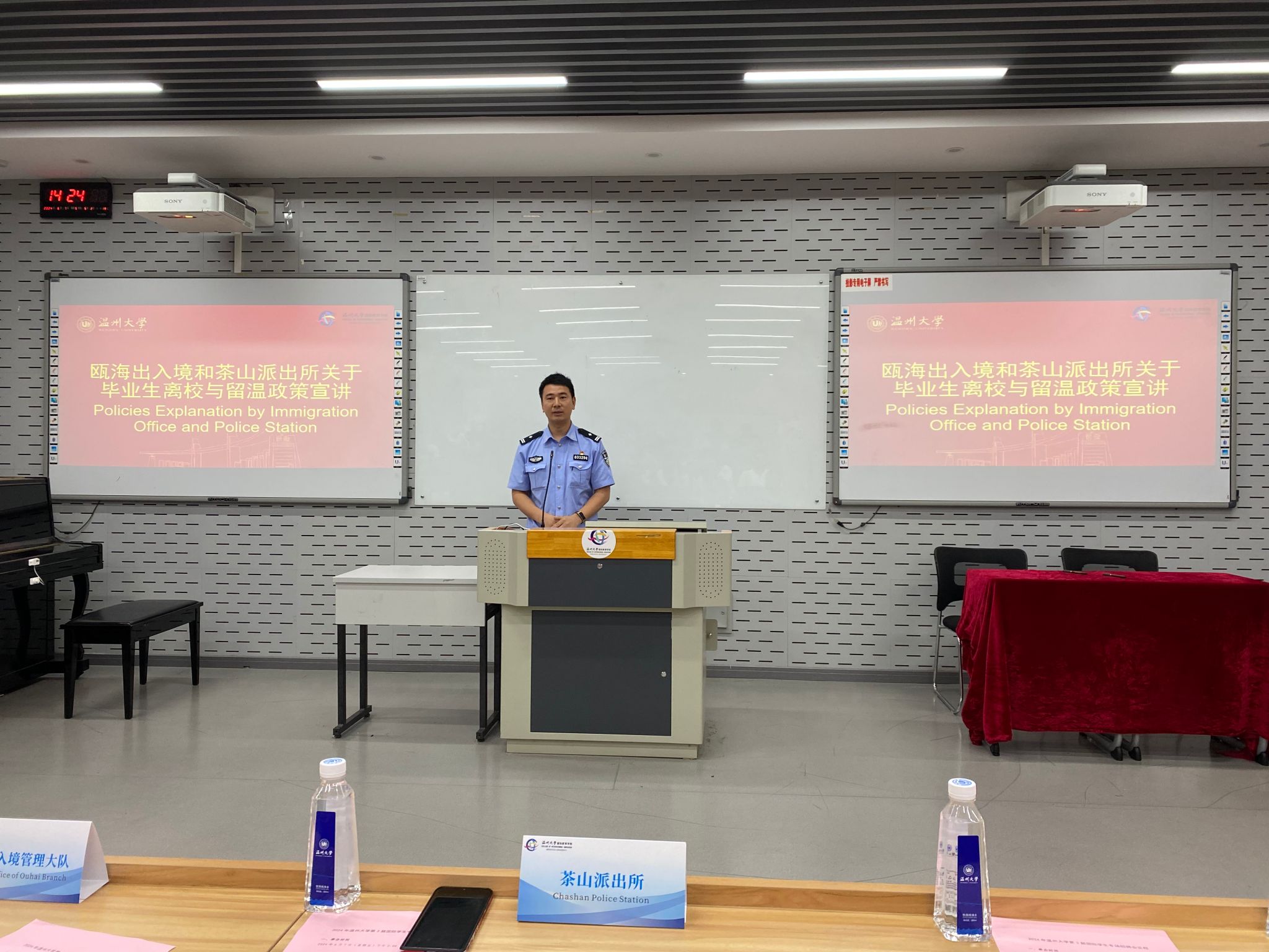 在签约仪式之后,温州市瓯海区出入境和茶山派出所的代表详细介绍了毕业生离校与留温政策。这些政策为留温工作的国际学生提供了便利条件,得到了在场学生的热烈响应。随后,16级硕士毕业生ADOFO MICHAEL ADJEI(洪太阳)分享了他在温学习和工作的经验,鼓励在校国际学生学好汉语、抓住机遇,积极融入。