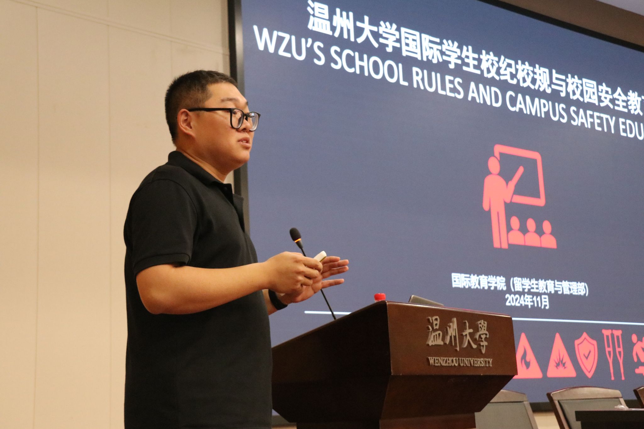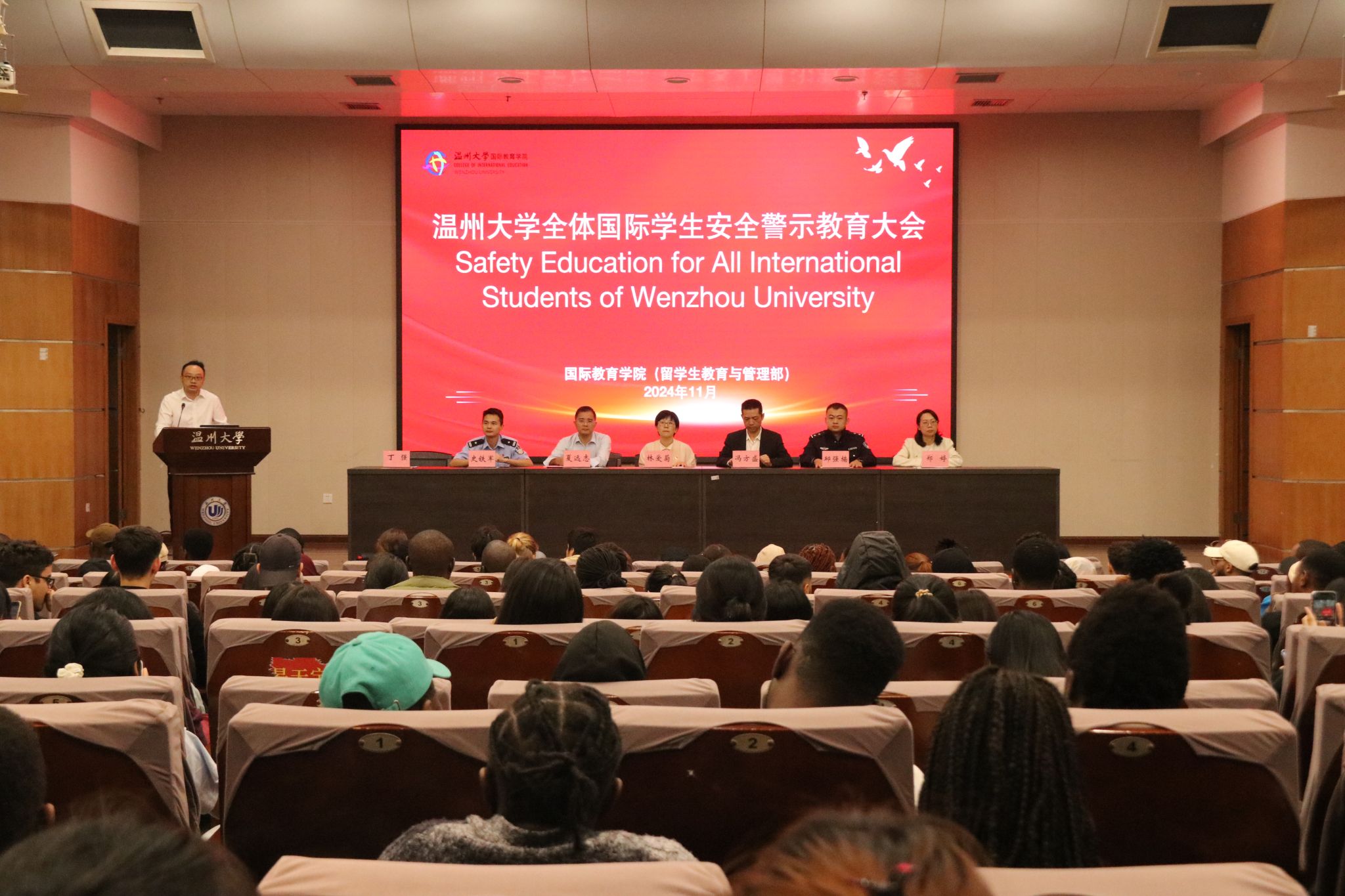 为进一步提升国际学生的安全意识,铸牢校园安全防线,11月13日下午,温州大学全体国际学生安全警示教育大会在北校区信息楼报告厅召开。温州市交警四大队八中队副中队长邱强楠、茶山高教园区派出所警长史铁军、温州大学安保部部长冯方盛、捷报即时比分网