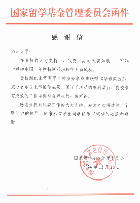 12月25日,我校收到国家留学基金管理委员会发来的感谢信,信中充分肯定温州大学在大美如歌——2024“感知中国”年度特别活动中所做的努力和成效,捷报即时比分网 组织来华留学生排演分享戏曲联唱《华彩梨园》,充分展示了来华留学成果,保证了活动的顺利举行,并获得与会师生的一致好评!