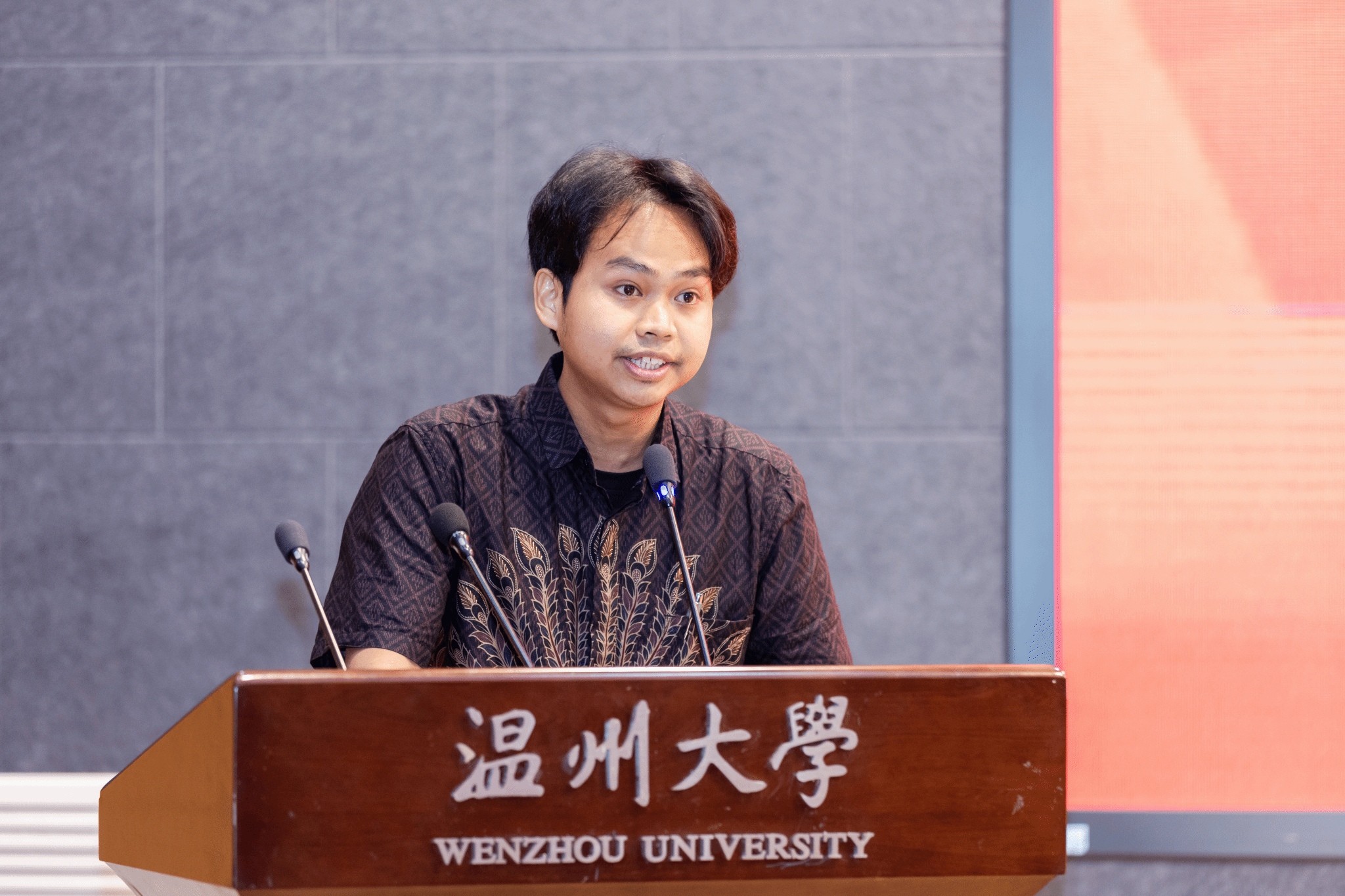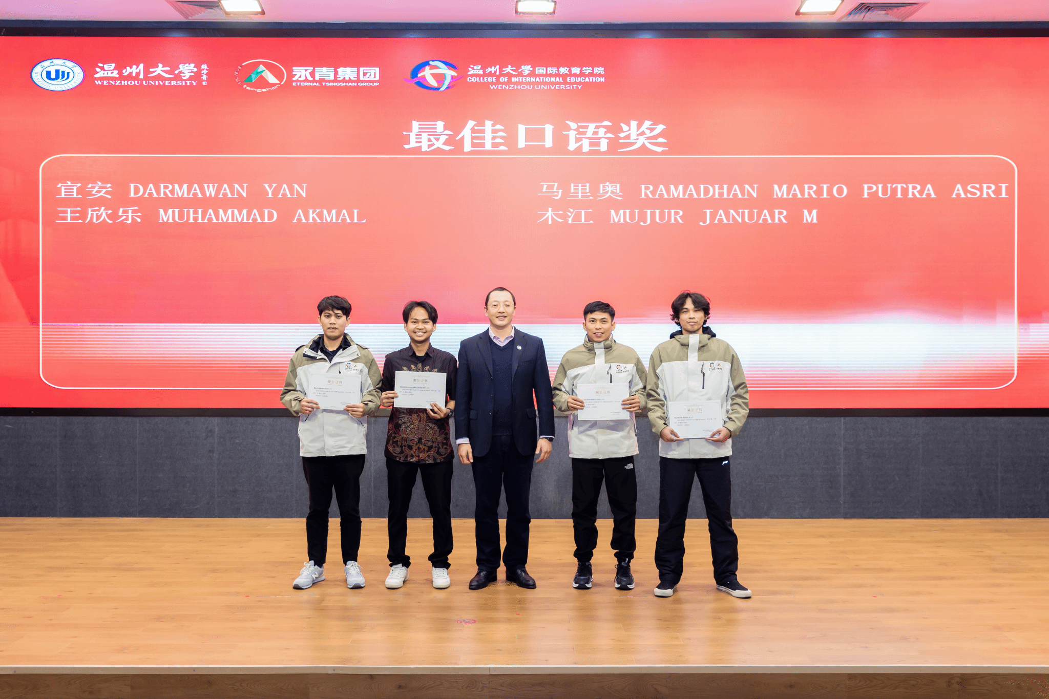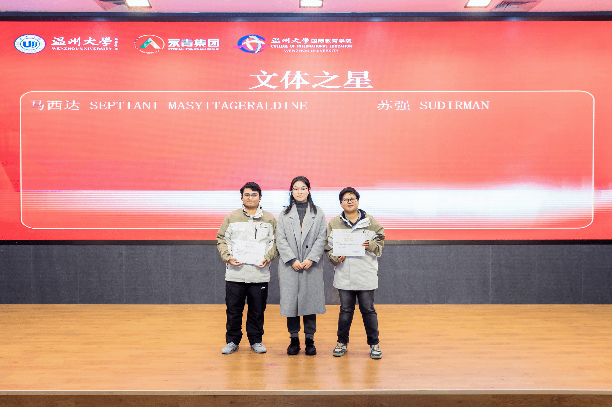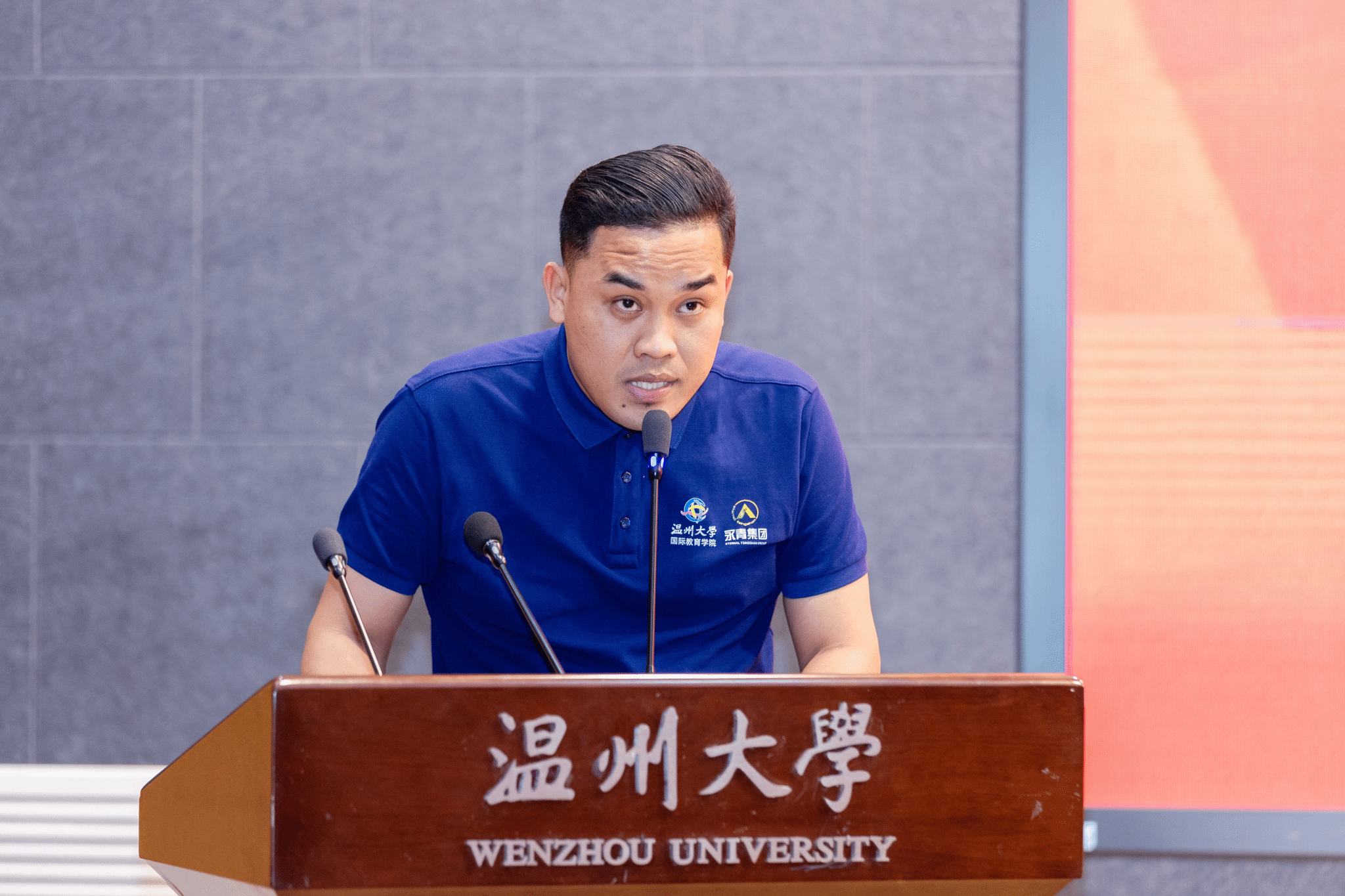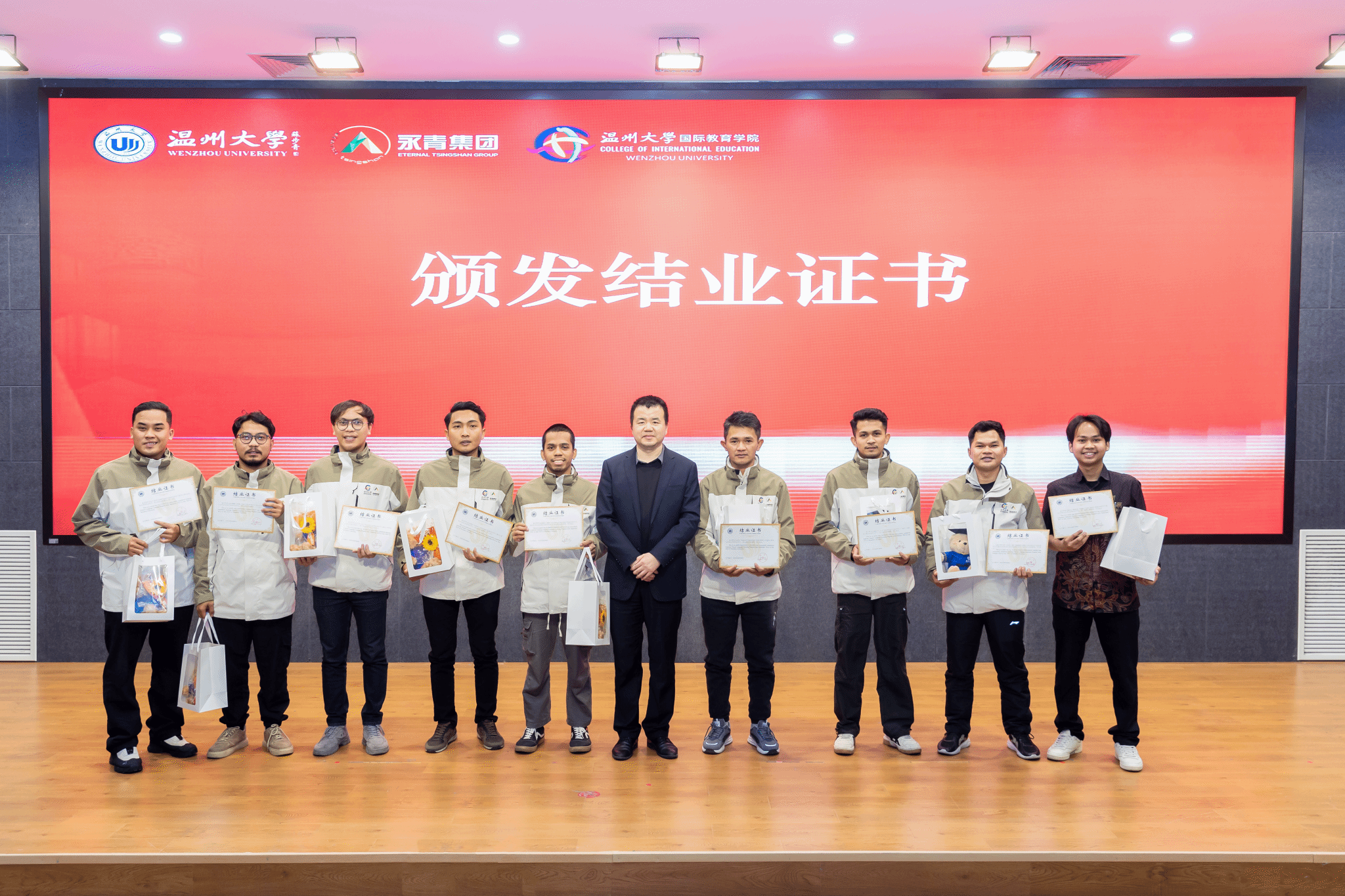 学员王欣乐和王富城代表第三期青山班学员分别做了发言。他们非常感谢青山集团和学院的精心栽培,感谢所有工作人员的辛勤付出。他们表示温州大学不仅是他们学习汉语的新起点,更是他们深入了解中国文化的窗口。在这里学习到的每一个汉语音节、每一个汉字,都化作了探索中华文明的钥匙,引领他们一步步走进这个博大精深的世界。
