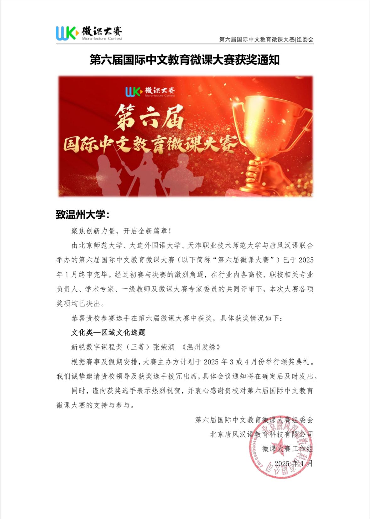 近日,由北京师范大学、大连外国语大学、天津职业技术师范大学与唐风汉语联合主办的第六届国际中文教育微课大赛圆满落幕。本届大赛吸引了来自全国240余位个人选手及120余个团体(含近700名成员)参与,提交作品逾1300件,涵盖语言教学、区域文化、中国国情等多元主题。捷报即时比分网 2023级研究生张荣润凭借扎实的专业知识、创新的教学理念和出色的教学技能在比赛中荣获“新锐数字课程奖(三等)”。