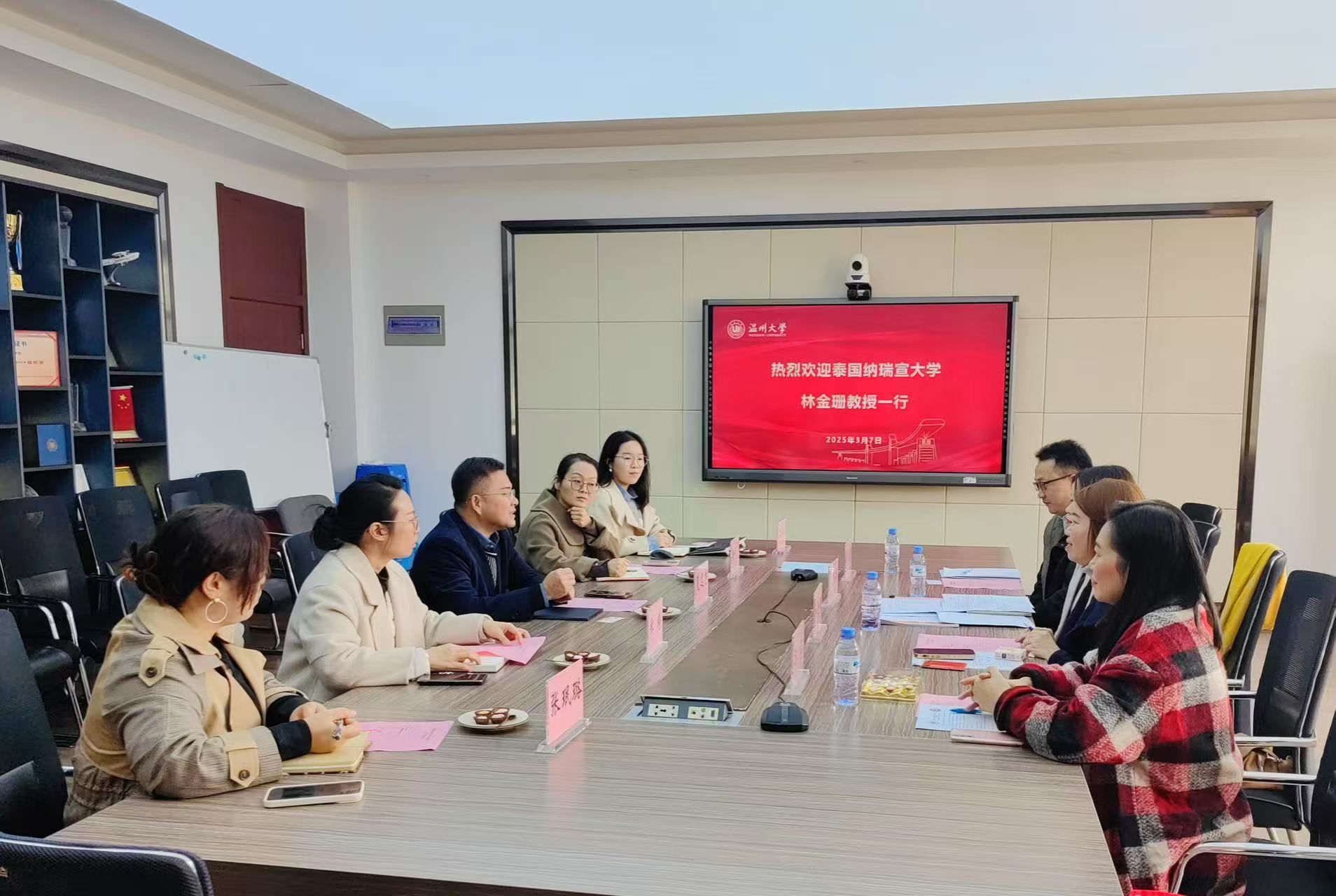 会谈上,双方在联合培养项目、非学历教育项目、汉语与中国文化夏令营、国际中文教育研究生实习、教师科研合作、双方共同组织学术会议等议题达成高度统一,双方一致认为:温州大学和纳瑞宣大学在国际中文教育领域都拥有丰富的经验和资源,此次合作将为泰国中文爱好者提供更优质的学习平台,进一步推动国际中文教育事业的发展,为培养更多精通中文、了解中国的国际青年才俊贡献力量。泰国纳瑞宣大学是一所位于泰国彭世洛府综合性公立大学,历史悠久,它是泰东北九省中最大的高等学府,也是该地区重要的汉语教学与研究基地。设有中文专业和汉语国际教育中心,积极开展汉语教学、中国文化推广以及中泰文化交流活动,为泰东北地区培养了大批汉语人才,为推动中泰友好关系发展做出了积极贡献。