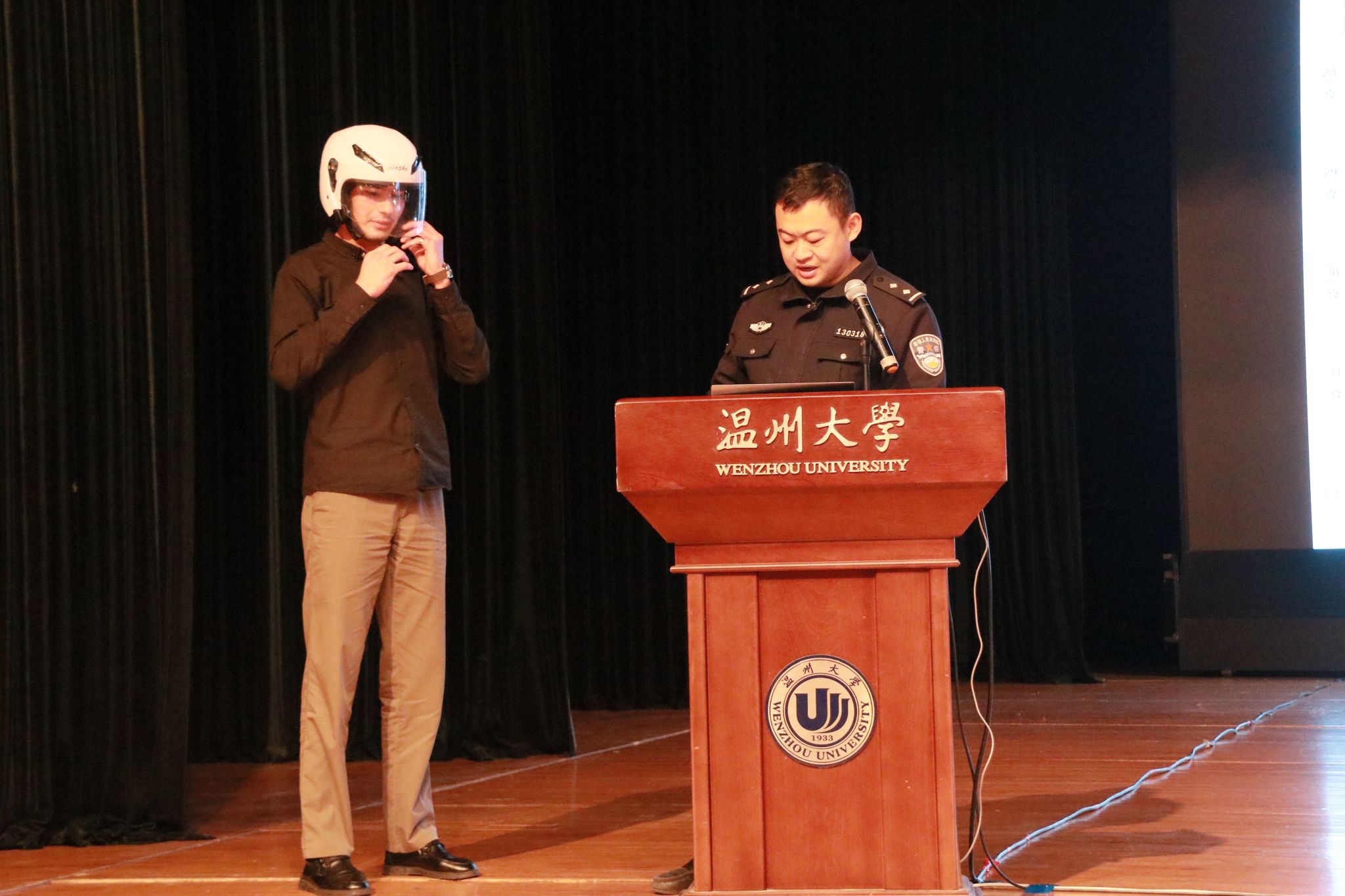 温州市交警四大队八中队副中队长邱强楠围绕交通安全展开深入讲解。邱队长通过一系列触目惊心的交通事故案例,直观展现违反交通规则带来的严重后果,以此强调遵守交通规则的重要性。此外,邱队长还为国际学生提供了实用的出行建议,提醒同学们务必遵守交通规则,过马路要走人行道,骑车要正确佩戴安全头盔等。