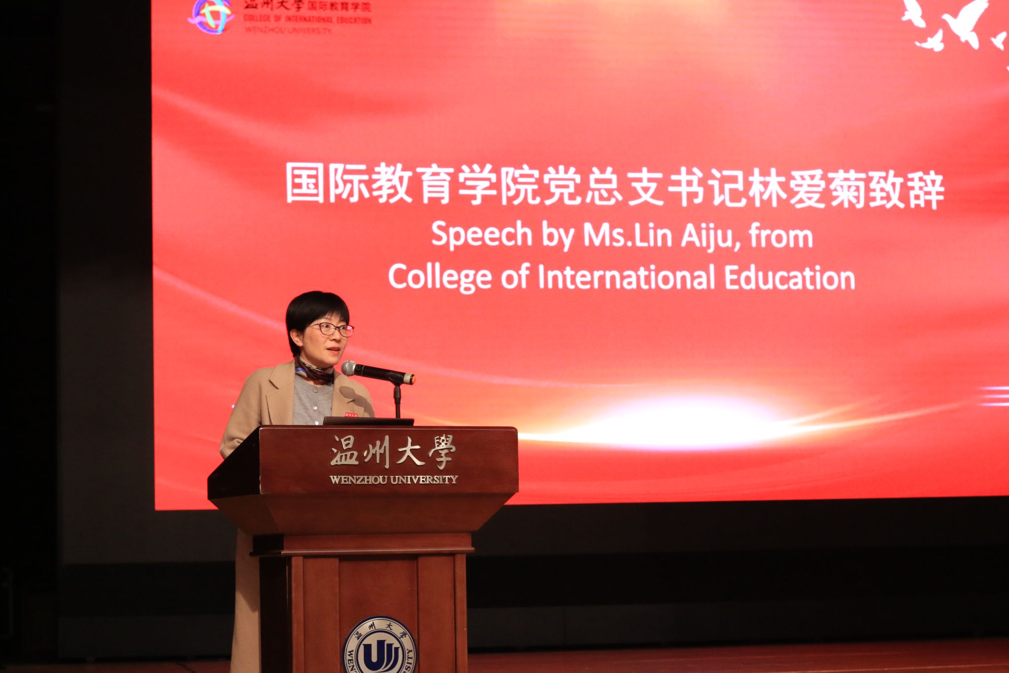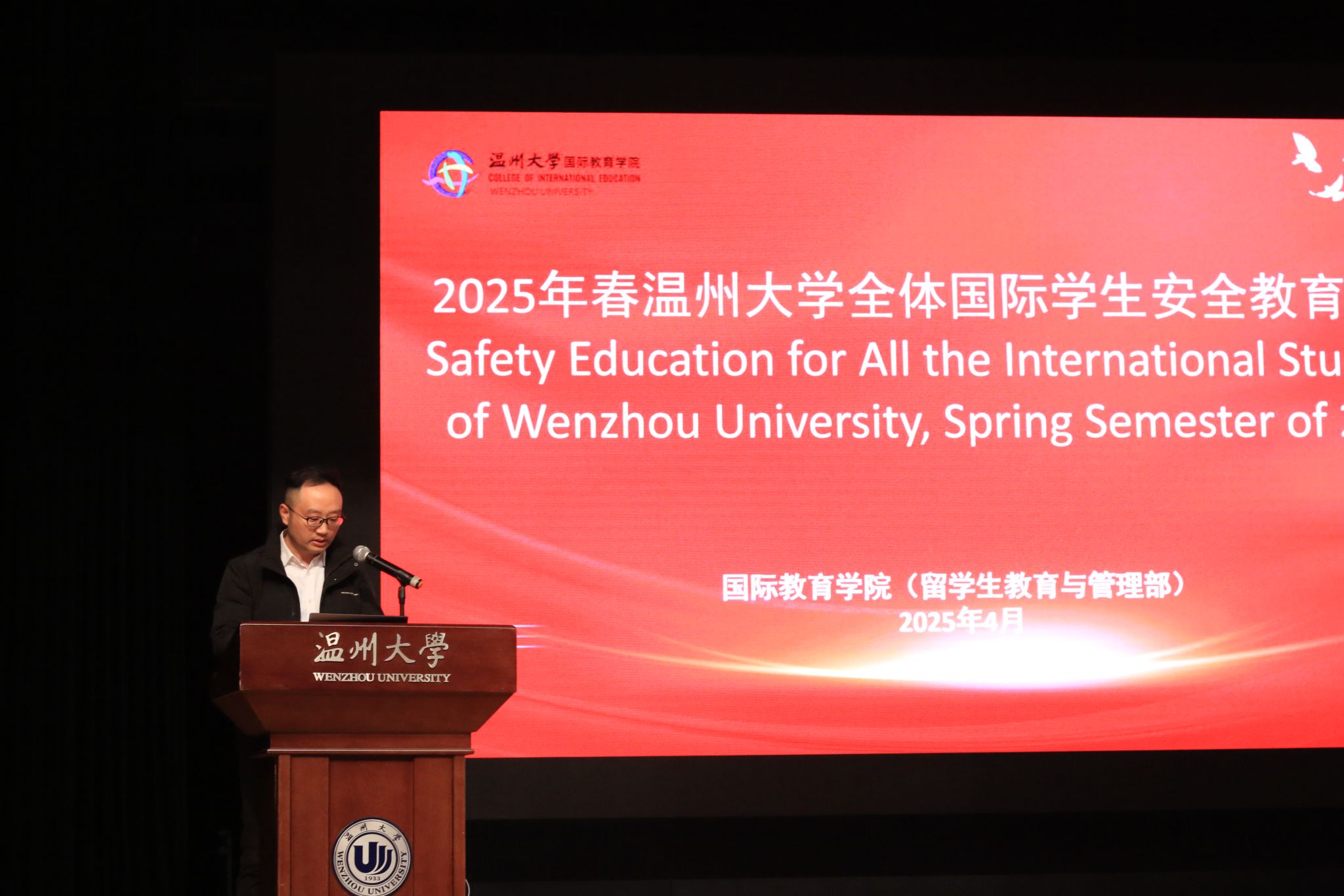 党总支书记林爱菊致辞。林书记强调了安全教育的重要性,并表达了对国际学生在温州大学学习生活的关怀与期望。林书记指出,保障学生的安全是学校工作的重中之重,希望同学们能够珍惜机会,认真聆听,不仅能成为安全知识的学习者,更能成为安全理念的践行者与传播者。