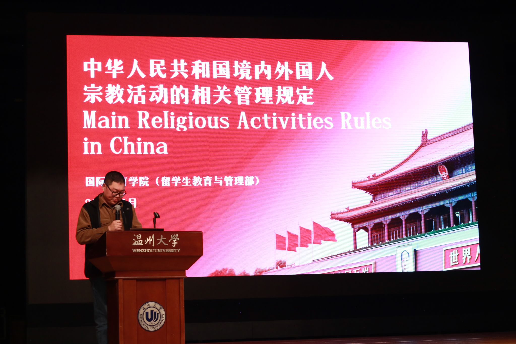 学工办主任刘天对《中华人民共和国境内外国人宗教活动管理规定》进行深入解读,帮助国际学生更好地理解并遵守中国关于宗教活动的法律法规。他特别强调,留学生严禁在非宗教场所开展宗教活动,校园内禁止任何形式的宗教活动。