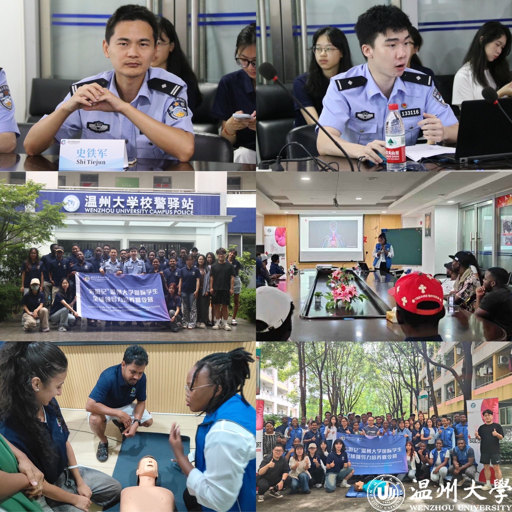 党总支书记林爱菊带来了精彩的"一带一路"职业规划讲座,温州国际传播中心主任郑国建分享了新媒体传播的前沿知识。文化体验环节同样精彩纷呈,健康管家钱绚瑶老师带领学员们感受中医文化的独特魅力,班长郝哲慧通过太极教学展示中国传统武术的哲学内涵,学员们还参观了温州大学校史馆,深入了解学校90余年的发展历程。实践培训部分,温州市瓯海区茶山派出所警长史铁军、钱启勋为学员们讲授了实用的安全知识,温州医科大学专业团队则开展了专业的急救技能培训。