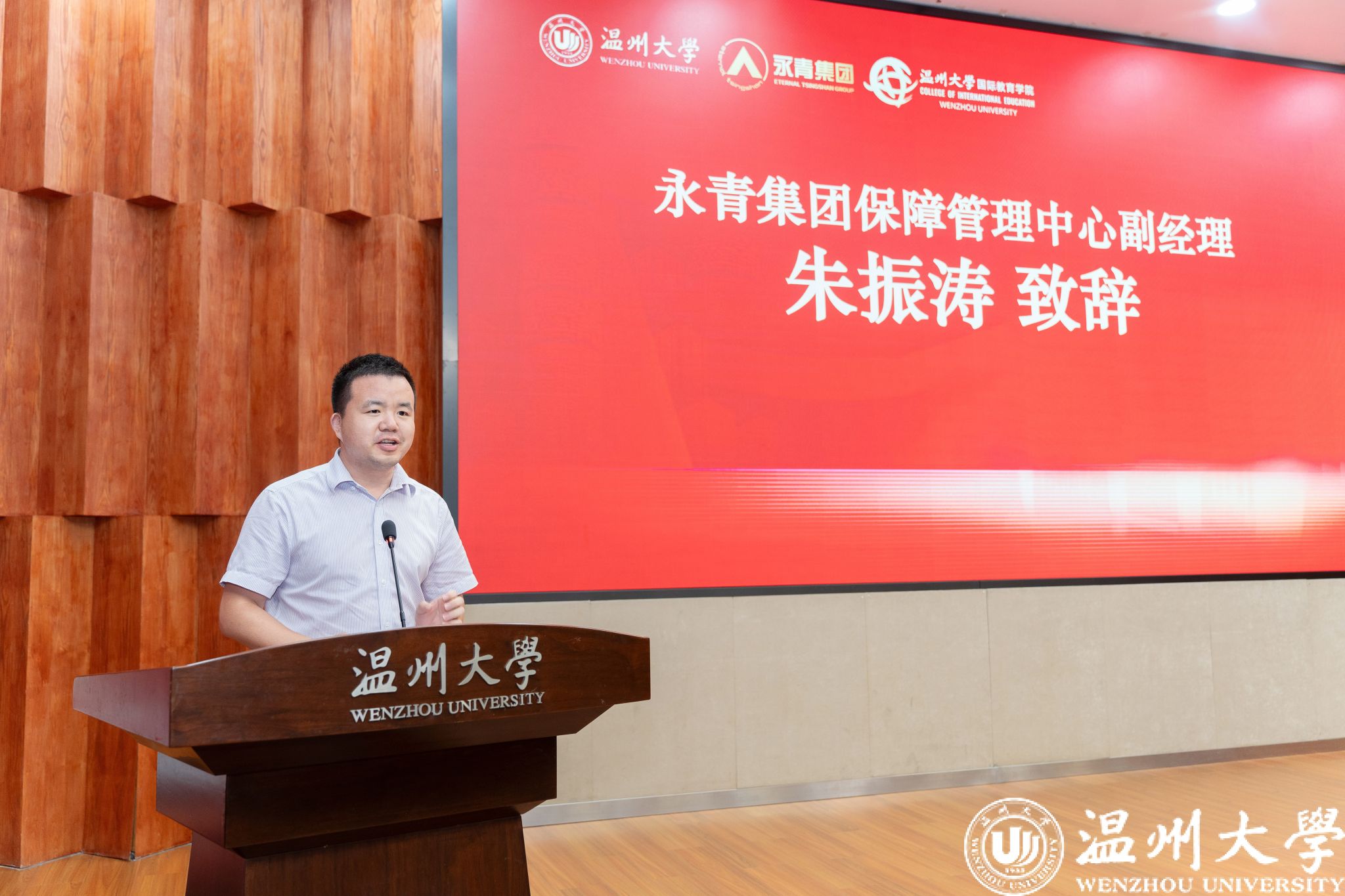 青山实业永青集团保障管理中心综合管理部副经理朱振涛在致辞中深情回顾了青山班的发展历程。他表示,自项目启动以来,青山实业与温州大学通力合作,共同培养了一批批优秀的国际化人才,并期待学员们将所学知识运用到实际工作中,为企业发展和两国合作贡献力量。