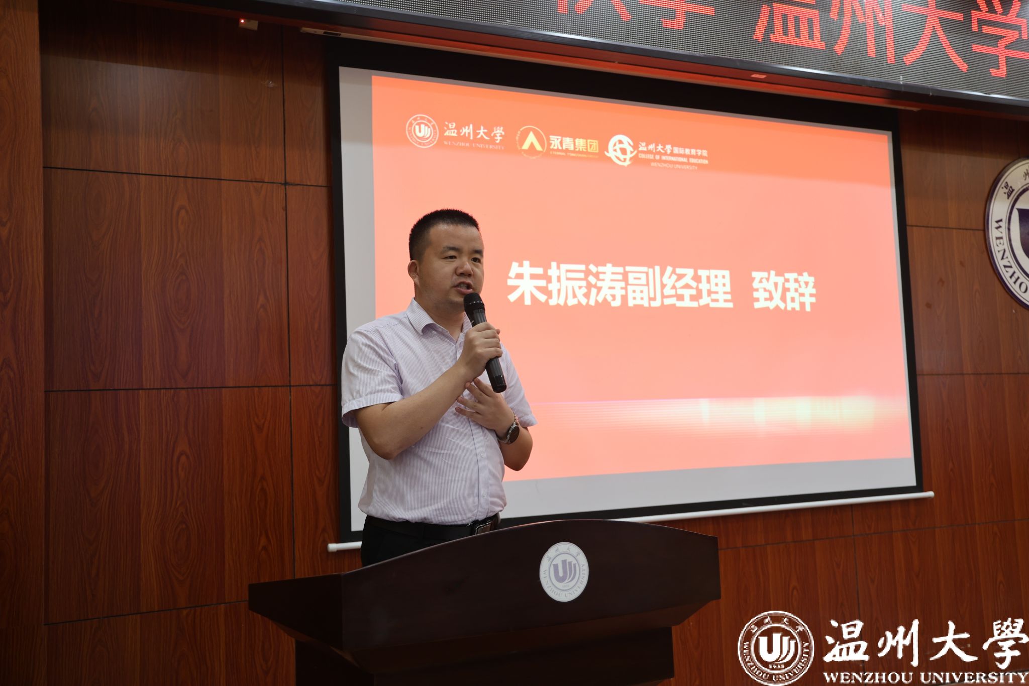 朱振涛副经理致辞。他感谢温州大学为青山班学员提供的优质教育平台,并祝贺学员们开启宝贵的留学之旅,并勉励大家珍惜难得的学习机会,尽快适应新环境、融入新生活,主动了解中国文化、青山实业及温州本地的历史与发展。他还特别叮嘱大家增强安全意识,做到结伴出行、集体活动提前报备,祝愿大家学有所成、平安健康。