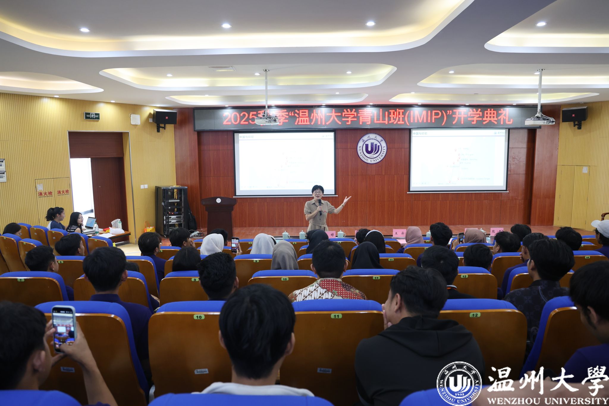 典礼尾声,林爱菊书记为全体学员讲授《开学第一课》。她从中印尼传统友谊谈起,生动介绍了浙江省及温州市的经济、地理与人文风貌,回顾了温州大学92年办学历程和“七校融合、两校合并”的发展脉络,阐述了青山班的设立背景及捷报即时比分网