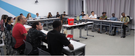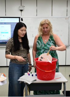 活动现场气氛温馨热烈。主讲教师黄雅琳、陈佳婧首先为留学生们详细讲解了漆扇的历史渊源、文化内涵及制作流程。这些介绍让在座的外籍友人惊叹不已,对即将开始的制作体验充满了期待。随后,在小组老师的示范与协助下,留学生们纷纷动手,从滴漆、调纹到转印、成型、晾干,每一步都做得有模有样。尽管不少学生是第一次接触漆扇制作,手法略显生疏,但大家热情高涨,互相交流帮助,现场笑语不断,其乐融融。