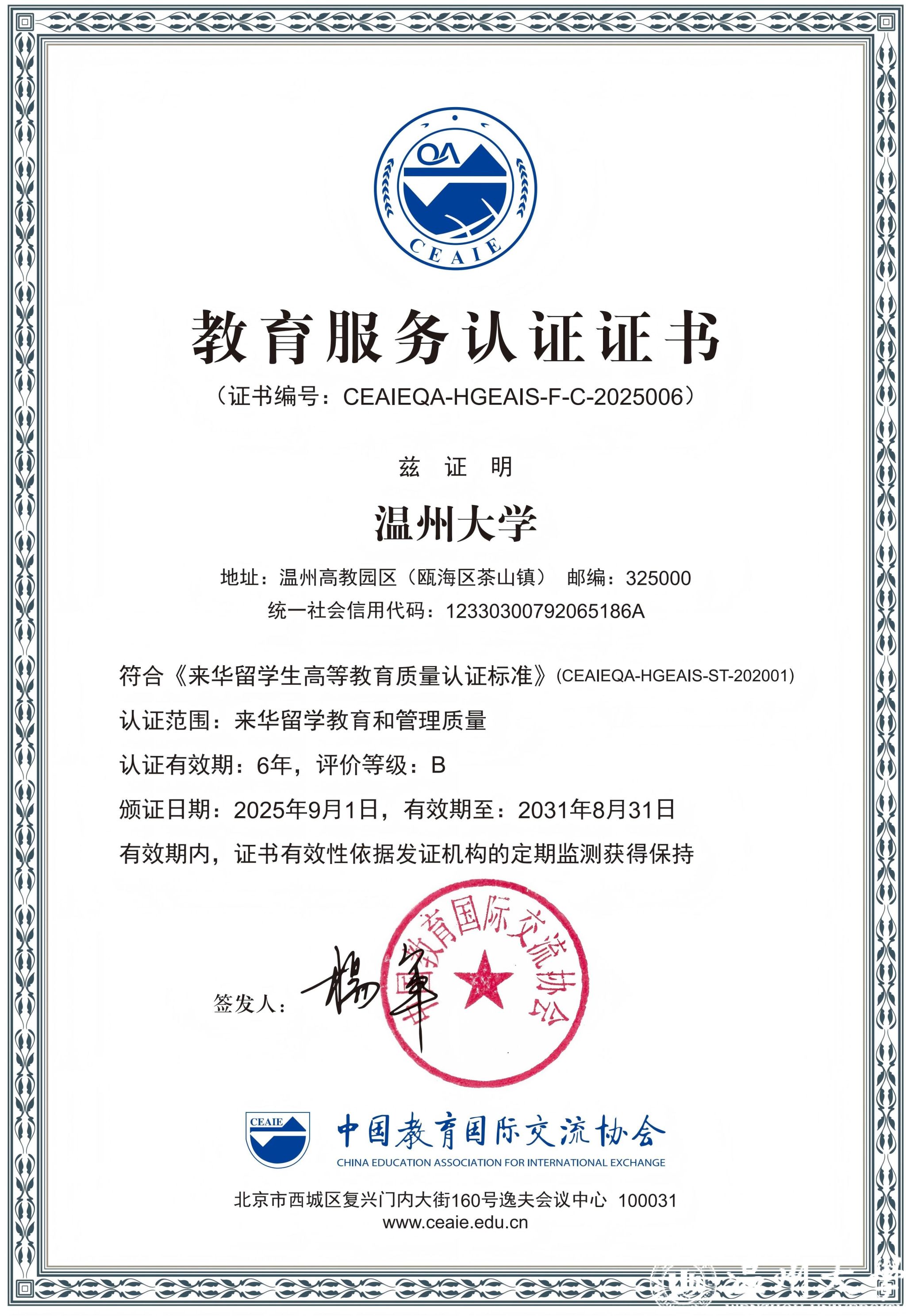 通过全国来华留学生高等教育质量认证,是对我校来华留学教育工作的高度认可,标志着我校来华留学教育迈入了新的发展阶段。学校将紧密围绕国家教育对外开放战略,依托自身办学特色与学科优势,秉持“以评促改、以评促建、以评促管”的理念,结合认证专家提出的整改意见,持续优化国际学生的招生、培养、管理及服务机制,切实提升来华留学教育质量与效能,不断擦亮“留学温大”品牌。在教育对外开放和教育强国建设的进程中,学校将积极贡献温大智慧与力量。