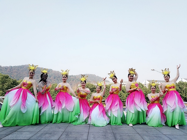 来自乌克兰、泰国、坦桑尼亚和乌兹别克斯坦等国家的9名外国留学生代表我校倾情演绎了古典舞蹈《荷塘月色》:在小桥绿水的衬托下,一曲《荷塘月色》更显江南的温婉多情;应着古筝乐曲,朵朵滴露的红莲徐徐绽放,又慢慢地升起,飘入云天;月色下一群窈窕秀美的红衣女子款款走来,轻捷的步子不停地旋转着,诠释了皎洁月色下的江南水乡情。“曲曲折折的荷塘上面,弥望的是田田的叶子。微风过处,送来缕缕清香……月光如流水一般,静静地泻在这一片叶子和花上,薄薄的青雾浮起在荷塘里……” 灵动的音乐缓缓流淌,观众们走进了多水的江南,受到观众们的一致好评。
