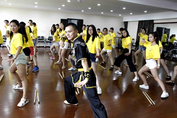 7月22日,2016“中国寻根之旅”优秀华裔青年商务营的营员们有了亲身体验中国功夫南拳的独特魅力的机会,在南少林温州五祖拳传人木权通老师与其弟子的指导下,他们一招一式认真地学起了中国功夫。