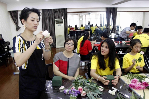23日,2016“中国寻根之旅”优秀华裔青年商务营的课堂上热闹非凡。与以往不同的是今天的课程营员们兵分三路:剪纸、插花、茶艺,随自己的兴趣选择学习内容。