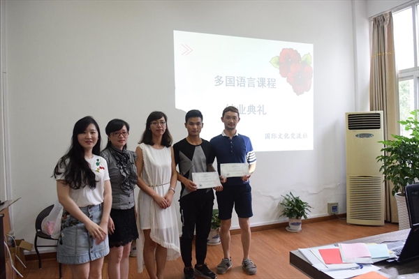 6月15日下午,在国际合作学院会议室召开了2016年春季多国语言课程结业典礼。国际合作学院副院长包含丽,学院办公室副主任、国际文化交流社指导老师廖一帆,国际文化交流社社长刘儒儒,全体各国语言老师,以及33位获得结业证书的学生出席了本次结业典礼,参与课程的师生们在典礼中热切交谈沟通。