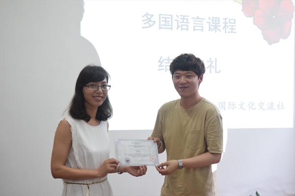 包含丽、廖一帆、刘儒儒代表社团与多国语言推广中心向参与授课的留学生颁发了感谢状,为结业学员颁发了结业证书;上课的同学们也纷纷分享了自己学习多国语言的感悟。在典礼结束后,师生们一起拍照留念,学员们兴奋地晒出了自己的结业证书。在各国文化的碰撞中,师生们热切交流、交换学习心得,并在所学语种国的国旗旁拍照留念,为本学期的语言学习画上了完美的句号。