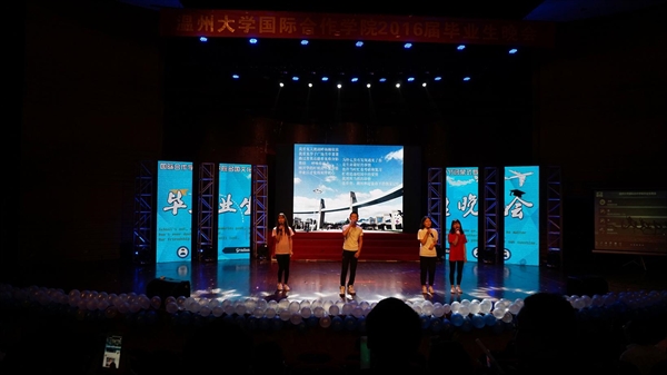 晚会在开场舞《Bang Bang》中拉开序幕。留学生的汉服秀及中华礼仪表演展示了中华民族传统服饰之美和传统礼仪文化之韵;歌曲《温大国合的日子》让大家重温了在国合大家庭四年学习和生活的点点滴滴;诗歌朗诵《遇见你好幸运》和情景剧《朝花夕拾》表达了学弟学妹对即将离开的学长和学姐的不舍与牵挂;而留学生王汉和他的搭档咪咪的《All about that bass》歌曲演绎则把晚会气氛推到了高潮。晚会最后,当主持人推上特别为2016届学子准备的庆祝蛋糕时,毕业班班主任带领全体毕业生合唱《不说再见》,同学们热泪盈眶,离别的情愫,不舍的眷恋,深深感染着现场每一个人。