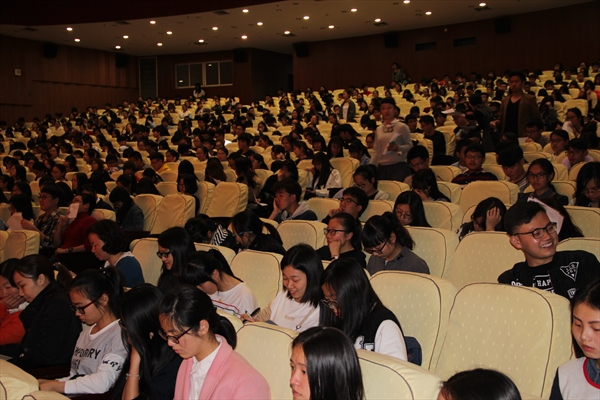 分享会伊始,主持人带领全场师生起立开展暖场活动,现场活跃的气氛充分体现了本次活动的主题----“每一个伟大的成就都是内心熊熊燃烧的结果”。随后,外事处叶苗处长向在场学生介绍了学校海外交流项目及学校的相关补助政策,并且表示,外事处将尽力帮助有意出国交流的学生成功走出去。朱晓申教授顺着叶苗处长的国际化话题,鼓励在场的学生“to be international”,争做国际化的学生。朱教授用regional、national和international三个词指出就读温大的在座学生有的来自于温州地区,也有的来自于全国其它地区。朱教授请学生思考一个有关他们切身利益的问题:毕业后去哪儿就业发展?是留在自己所在的地方区域,to be regional,还是前外国内其它地区甚至国外,to be national or international?朱教授认为,温大推行国际化本科教育,是因为学生所在的专业以及学生将来参加工作的单位都在国际化(international)。学校培养出来的人才既要具备满足自身生存需求的专业知识和能力,又要符合用人单位的国际化发展需求。朱教授将学生的专业和专业课的公共基础课——大学外语比喻成学生的左、右翅膀。只要让这两只“翅膀”强壮起来,学生就能够在世界这个“地球村”里飞得更高,走得更远,因而从闭塞的地方小作坊幸福地登上放眼世界的国际化就业平台,前途一片灿烂。然而,学生的国际化发展(to be international)需要越过社会对学生外语能力认可这道槛。那些大学英语全国四、六级考试成绩合格的学生往往受到用人单位的青睐,雅思、托福等国际测试成绩合格的学生比较容易踏出国门深造留学,通过全国研究生外语统一考试的学生才有机会被录取攻读硕士学位。显然,就学生的专业学习和今后的发展而言,外语的作用举足轻重。朱教授指出,全体大学外语教师正在为提高学生的外语应用能力,帮助学生to be international做出应有的努力,本次分享会即是一个例子。朱教授希望在座的同学们从外教Ely的大学生涯以及刘书云老师的“认知自我,狂恋英语,游历世界,精彩人生”等演说中认识自我、掌握学好英语的方法。