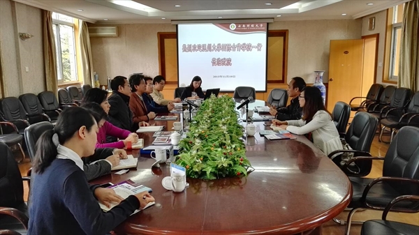 调研团队进行了座谈,国际工商学院党委副书记杨秀伟向我们详细介绍了该院中外合作办学项目的发展历史、特色品牌和教学管理经验等,随后双方在学分管理、师资建设、课程设计、教学监督和项目基地建设等方面作了有益的交流,双方期盼今后两校两院在中外合作办学方面进一步加强交流与合作,进一步提升两校的中外合作办学水平。
