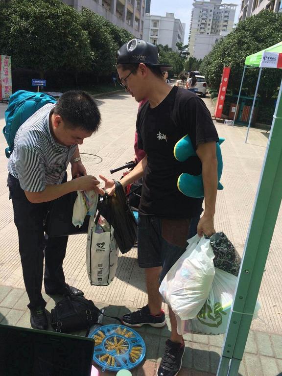 的新生全部安排在超豪学区E区,上午7点开始,迎新点就陆续挤满了来报到的新生同学,核对录取通知书、报到注册、分发资料、领取钥匙饭卡、疑难解答、行李搬运、送新生到宿舍,现场接待热情有礼,手续办理有条不紊,细致周到的服务工作,获得了新生和家长的一致赞许。