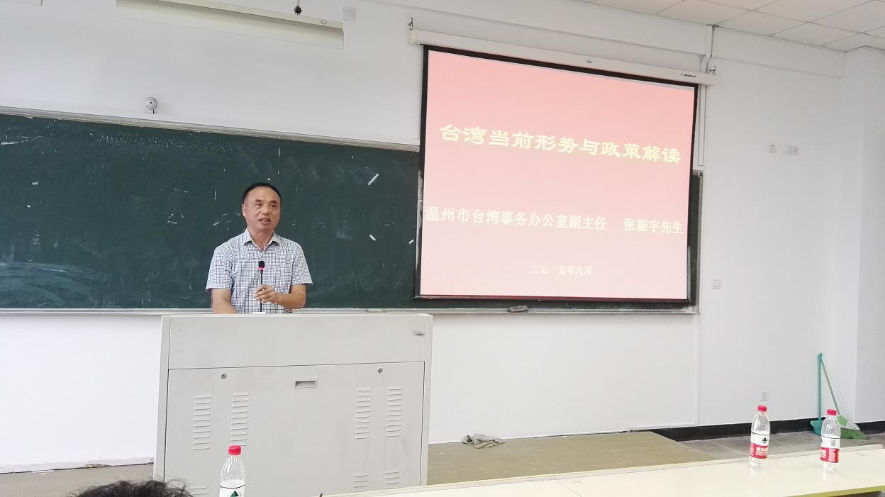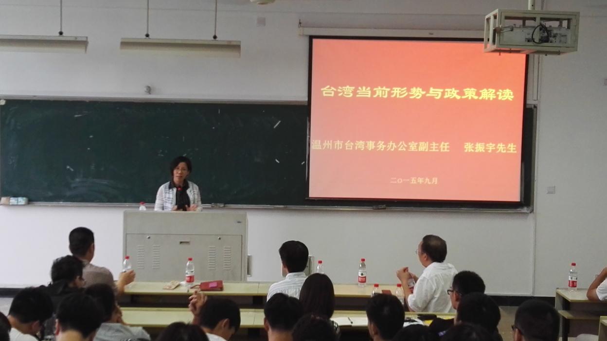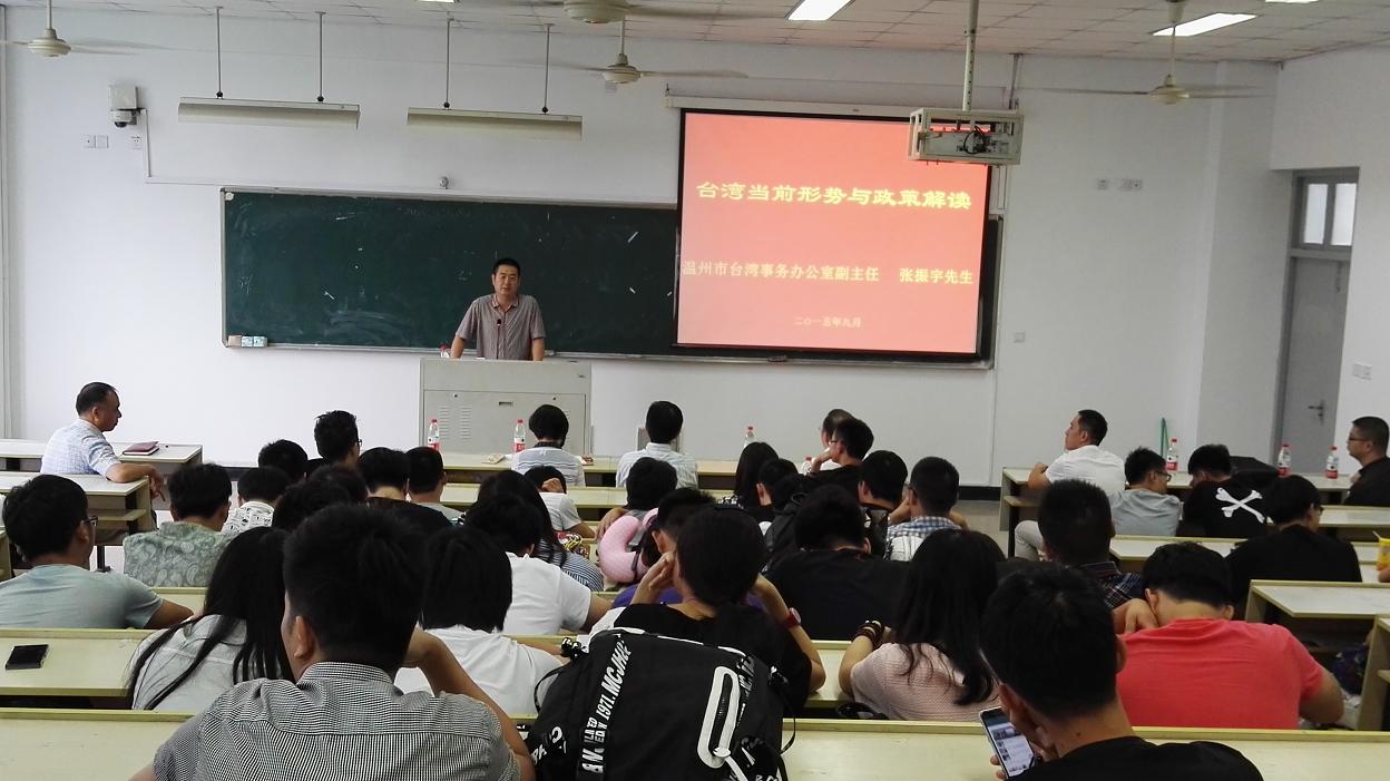 张振宇副主任为全体同学和老师作了“台湾当前形势与政策解读”的报告,他详细介绍了温州市台办对全体同学赴台学习交流的具体要求,并结合台湾地区当前的环境形势和风俗习惯,对如何融入当地学习和生活做了适应性的通识教育,鼓励各位同学要有较好的自律自强能力,主动有效地完成在台湾的各项学习任务,收获不一样的人生体验和学业成果。
