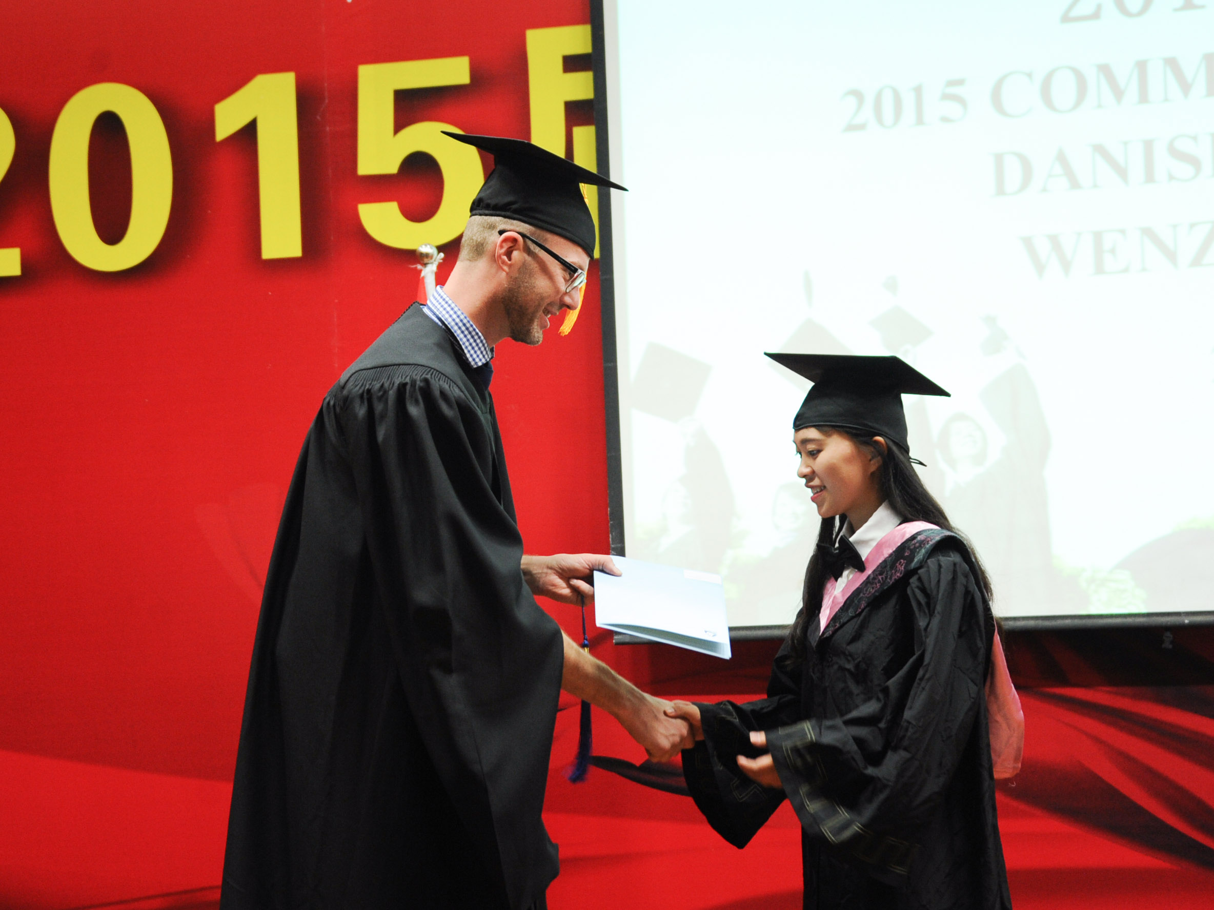 近日,11级中丹班的学生更是体验了中西两场隆重的毕业典礼,在典礼上温州大学校长蔡袁强教授和丹麦尼尔斯布鲁克哥本哈根商学院副校长Claus Villumsen先生分别为11级中丹班的学生颁发了温州大学本科毕业证书、管理学学士学位证书和丹麦尼尔斯布鲁克哥本哈根商学院国际营销管理专业学士学位证书。典礼上,国际合作学院院长严晓鹏寄语2015届毕业生要保持对自己未来的好奇心和耐心;保持终身学习的习惯;始终以全球化的视野认识世界;更要保持一颗善良的心。