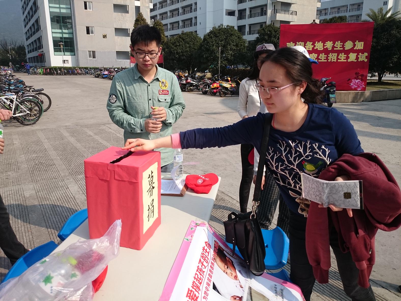 三月是学雷锋月,近日,在温州大学国际合作学院青年志愿者协会的组织下,一场以“情系雷锋月,爱洒三月天”为主题的爱心募捐活动在校园内温馨上演。活动现场,来自全校同学纷纷伸出援助之手,慷慨解囊,为患有地中海贫血症的四岁半女孩陈若夕筹集医药费。