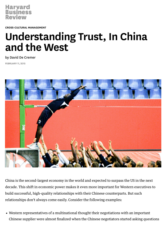2015年2月11日,英国剑桥大学商学院教授、温州大学国际合作学院客座教授David De Cremer,以温州大学为第二作者单位在顶级期刊《哈佛商业评论》上发表文章《Understanding Trust, In China and the West》。
