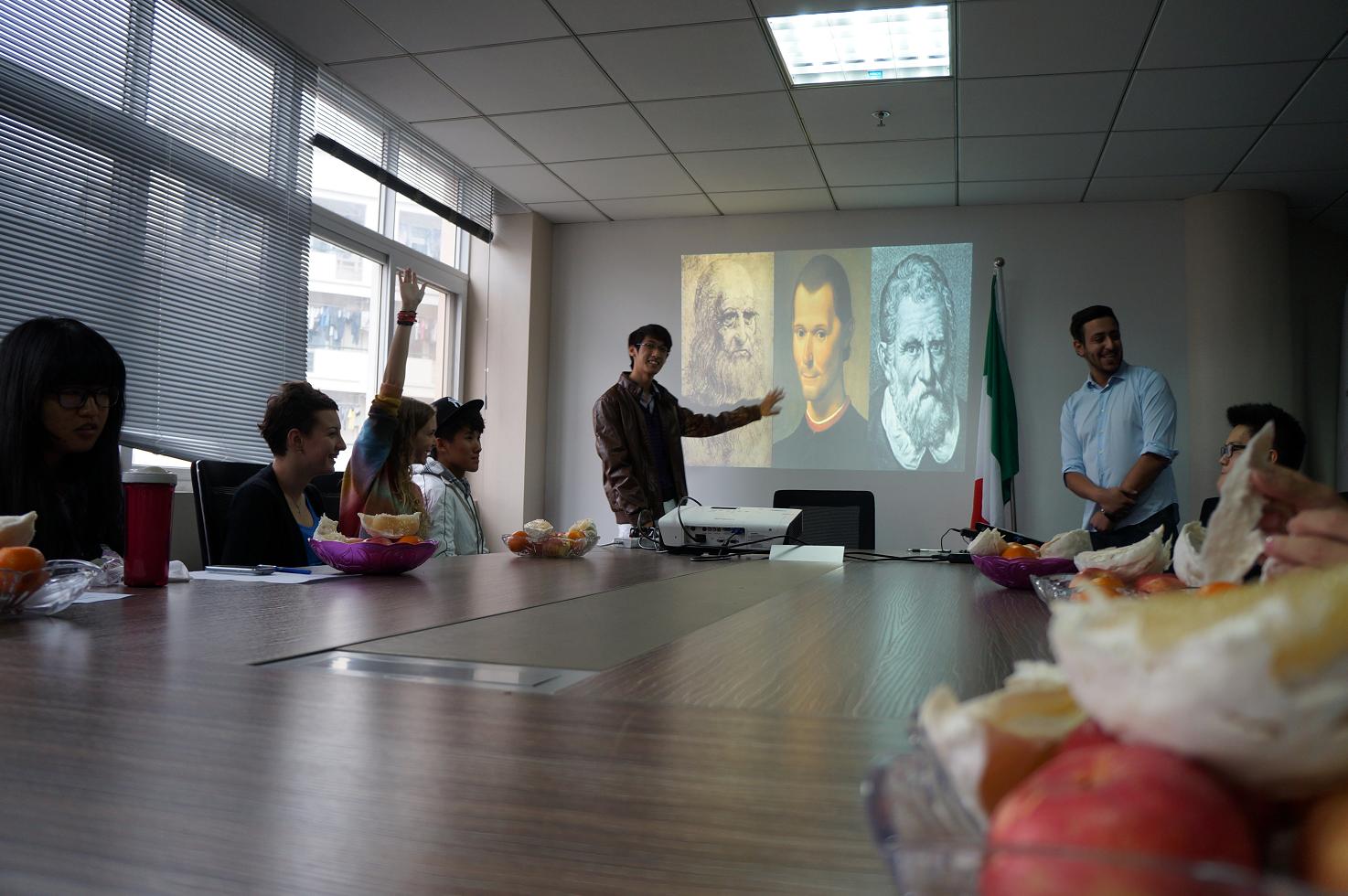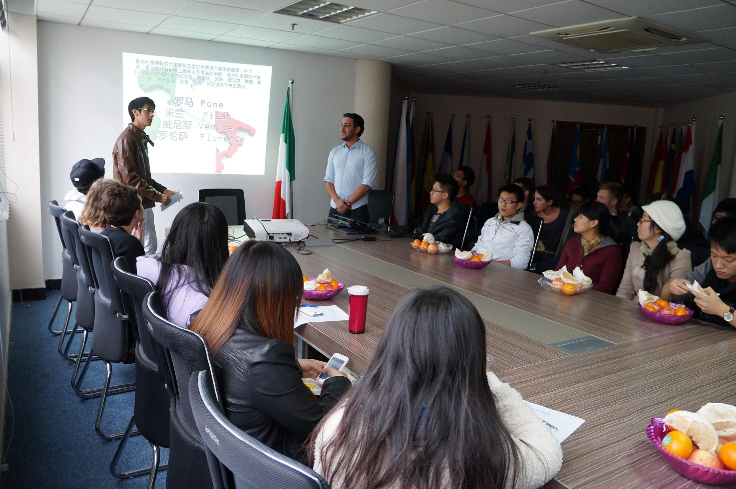 国际文化交流社承载着温州大学多国语言推广中心与国际文化交流中心开拓温大学子国际化视野与融入国际社会的重要责任。社团开办以来,举办了多国语言课程、文化讲座等一系列活动。此次意大利文化沙龙邀请了温州大学意大利籍华裔留学生叶东来Michele与意大利留学生Laith Alsmady担任主讲,活动介绍了古老而又神圣的国家----意大利的日常习俗,著名城市,悠久历史,宗教,哲学发展与人物思想碰撞历程,帝国的繁荣与过失,古代遗迹,优美风景,体育竞技以及意大利饮食文化和现代潮流;其间安排了趣味竞答以促进中方社员更好的了解意大利。随后中方社员与外方社员就意大利文化进行了跨文化互动交流,增进了社员的国际化视野与国际化素养。