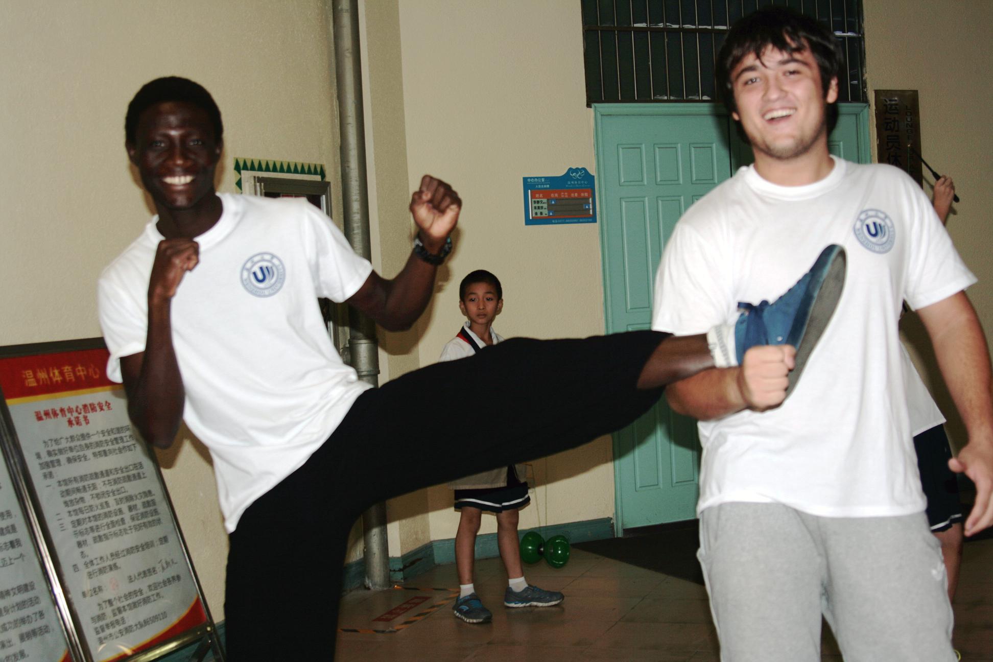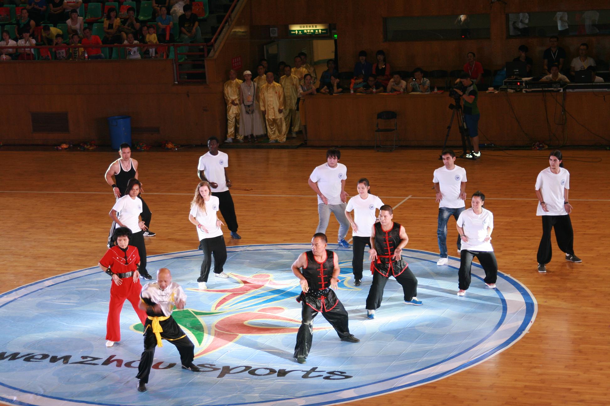 2013年9月28日下午,“体彩杯”第二届温州市体育社团活动月风采展在市体育中心拉开帷幕,我校来自尼日利亚、意大利、巴布亚新几内亚等8个国家的9名留学生作为南拳的爱好者参加了本次演出活动。他们一出场,就赢得了热烈的掌声,虽说他们初学不久,但依然打得有模有样,他们对武术和南拳的热爱之情感染了现场观看的市民朋友。
