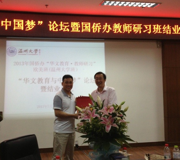 论坛结束后,与会领导还为参加2013年“华文教育•教师研习”欧美班的学员们颁发了结业证书和纪念品。据悉,本次培训班由国务院侨办主办,浙江省侨办、温州市侨办协办,温州大学承办,共有来自11个国家的35名华文教师在温州接受以小学课堂教学技能训练为重点的系统培训。