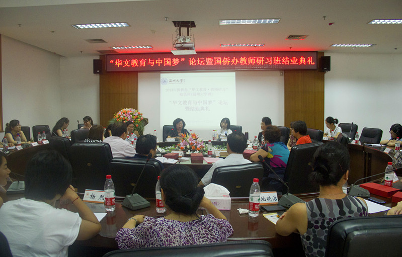 7月24日下午,温州大学在茶山南校区岩松堂展示厅隆重举行“华文教育与中国梦”论坛暨2013年“华文教育•教师研习”欧美班结业典礼。浙江省人民政府侨务办公室副主任徐高春,文宣处处长王云奇,温州市侨办副主任许捷,党组成员、文宣处处长叶斌斌,温州大学国际合作学院院长严晓鹏等领导出席了本次论坛暨结业典礼。