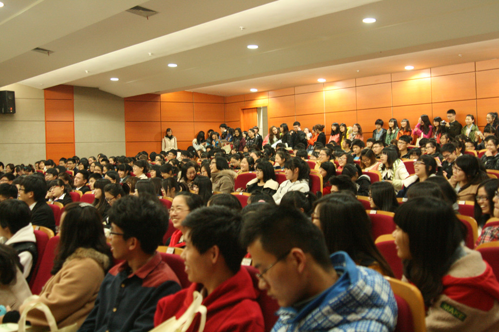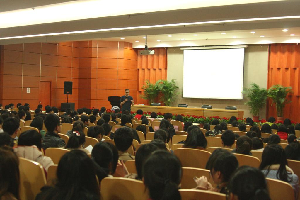 许多同学在讲座前1小时就早早来到现场等候,讲座开始前半小时,雁山厅内早已座无虚席,过道内也已站满了同学。作为一个道地的美国人,能说一口纯正的美式英语并不稀奇,当John一上场便用流利的“京片子”说出开场白时,立即引发听众们的热烈掌声,瞬间点燃了现场气氛。John通过中美文化的差异,讲诉了自己在中国所遇到的趣事。通过自己学习汉语的经历,鼓励同学们学好第二语言,并向他们教授了自己首创的“Triangle(三角形)”学习法则:Communication、Imitation、Reading Aloud。John具有极强的现场掌控力,没有了语言的障碍,他更是将自己的幽默与风趣发挥得淋漓尽致,声情并茂的演讲仿佛一块巨大的磁铁牢牢抓住了现场听众的注意力。现场互动积极,掌声、欢笑声不断将讲座推向高潮,同学们对英语学习的兴趣与信心慢慢在脸上显现。