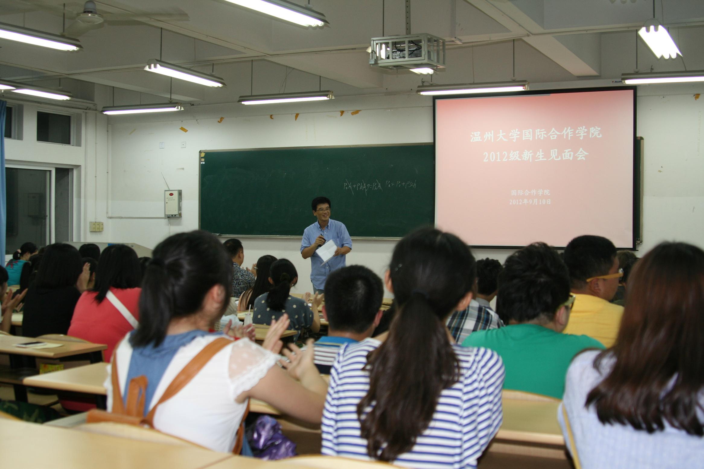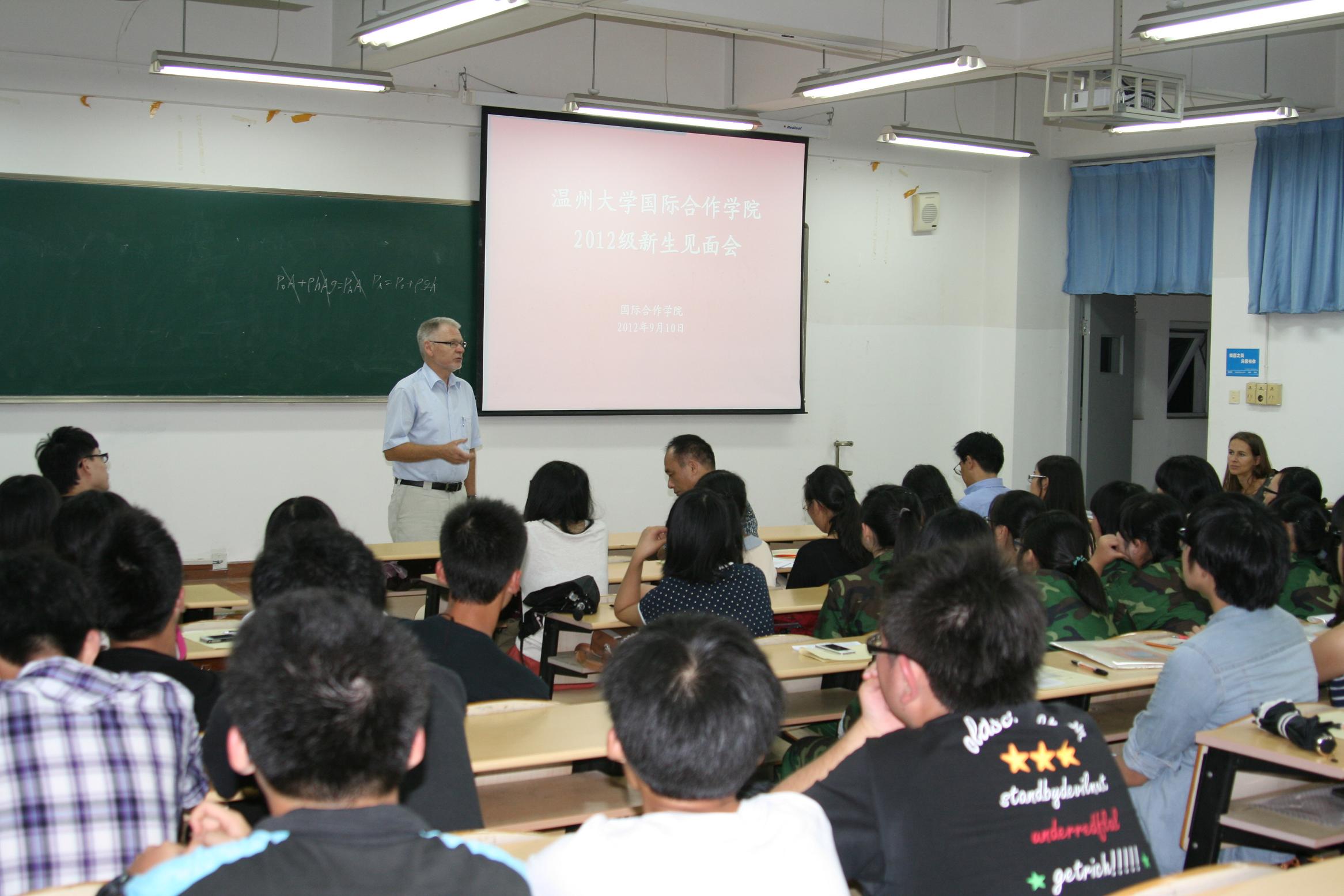 2012级中丹合作项目市场营销专业新生见面会于南校区7D-402举行,学院党总支书记朱建平、副院长陈军、中丹项目办学主管Jorgen Dalhoff教授、丹麦方教师代表Dorthe教授以及新生班主任缪维嘉老师和陈翊老师出席本次会议,会议由学生科陈赞安老师主持,共有65名新生参加本次见面会。