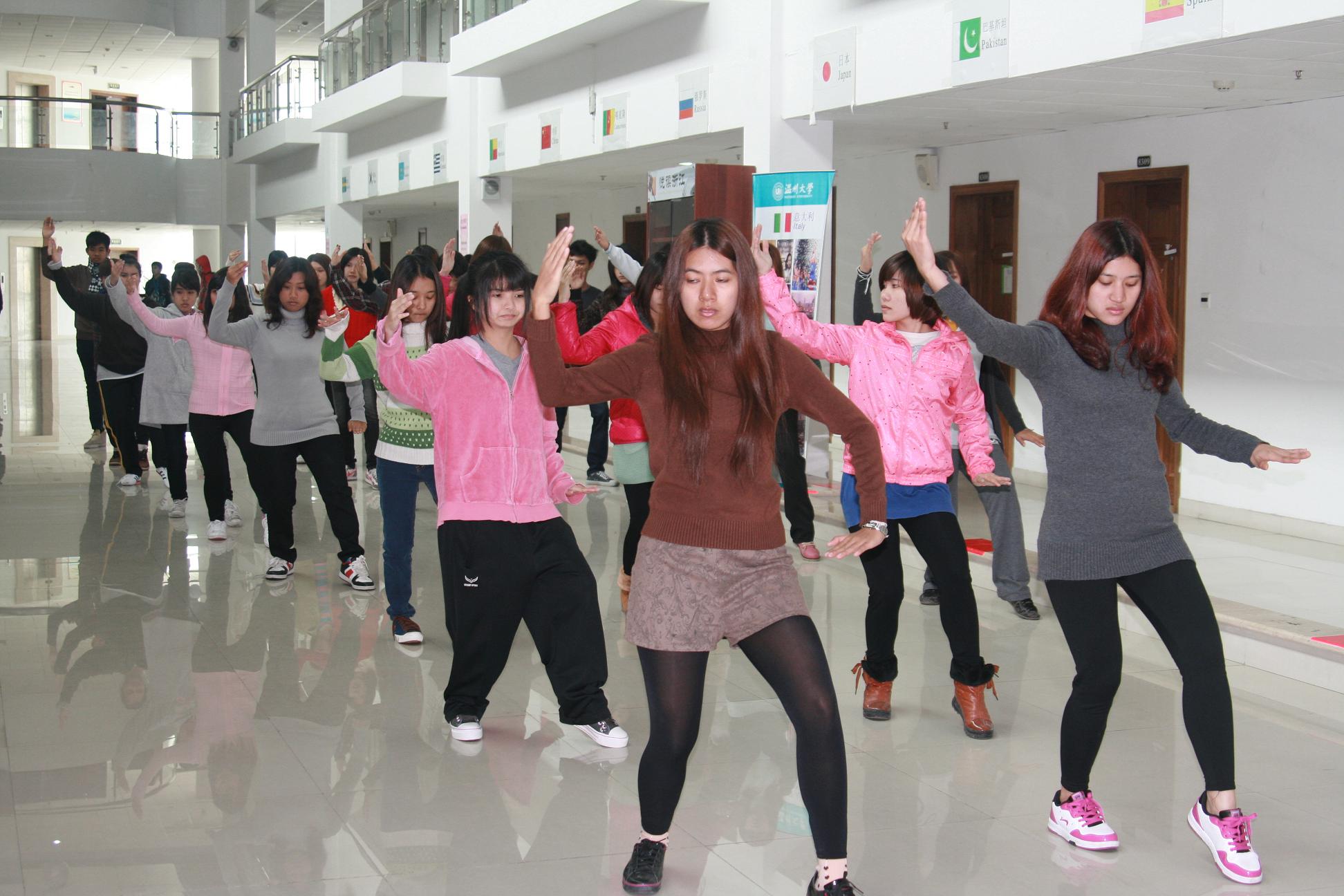 在本学期特别为泰国留学生开设了“太极拳”体验课程。一群朝气蓬勃的留学生在老师的指导下,满怀激情地学练“太极拳”。