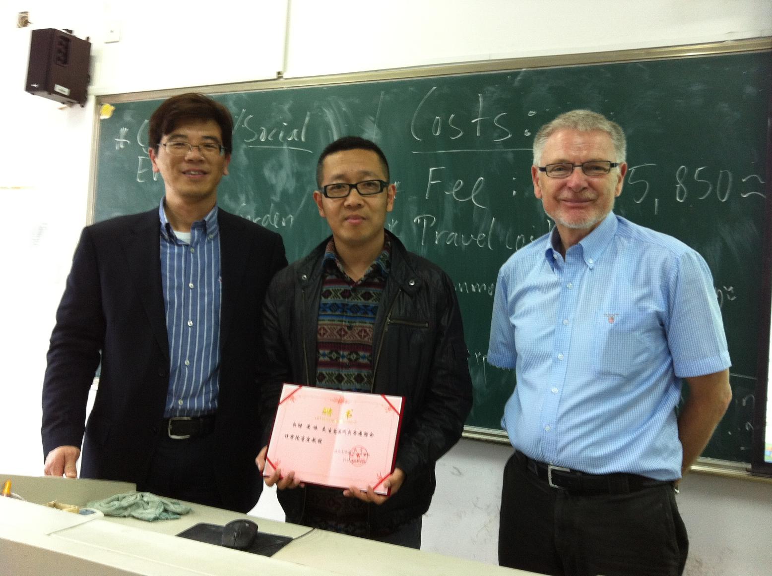在7D-407教室举行了聘任黄振先生为国际合作学院客座教授的仪式。院长严晓鹏、副院长陈军、中丹合作项目丹方项目经理Jorgen Dalhoff先生参加了聘任仪式。