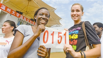 昨天,温州大学北校区运动场上,温大国际合作学院的留学生在展示比赛号牌。当天,该学院举行了首届田径运动会,200多名大学生运动员,参加了100米短跑、1200米中长跑等10项田径类比赛项目。比赛中,占参加人数仅五分之一的国外留学生,却拿下了近半数的奖牌。 据介绍,该学院有来自全球20多个国家的留学生,校方表示,希望通过运动会,搭建中国学生与外国留学生更好的交流平台。(2010.10.10 温州都市报)