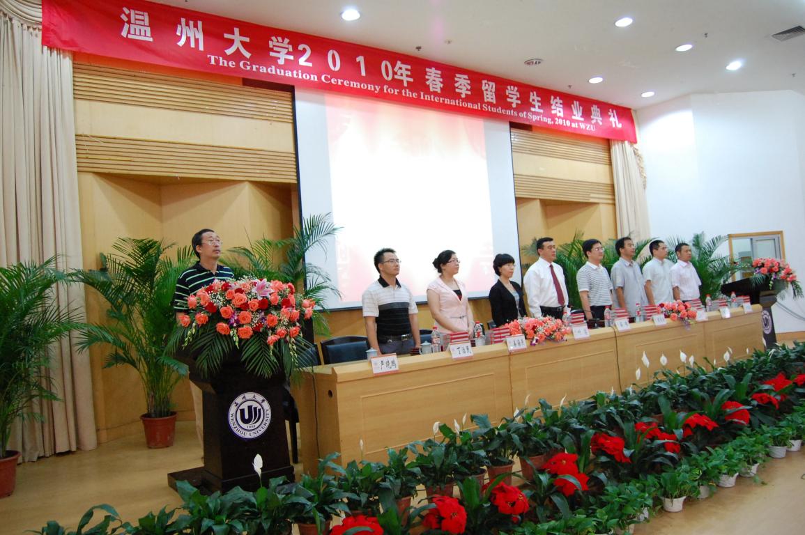 7月1日下午,温州大学2010年春季留学生结业典礼于南校区雁山厅隆重举行。副校长薛伟教授出席。外事处、教务处、学生处、校友办公室、团委、人文学院、国际合作学院等部门学院的领导、留学生授课教师代表以及来自泰国、日本、伊朗、西班牙、意大利、荷兰、肯尼亚、南非、加拿大、俄罗斯等10个国家的50余名留学生参加了结业典礼。结业典礼由国际合作学院院长严晓鹏主持。