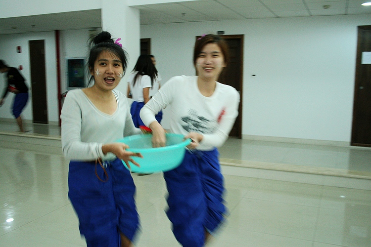 活动中,身着泰国传统服饰的留学生向老师行洒水礼,把象征尊敬和感恩的“圣水”洒到老师的手中,接到“圣水”的长辈把象征祝福的中国结交到学生的手中,祝愿学生在温大顺利完成学业,在新的一年里健康成长。为了节约用水,泰国留学生把泼水改成洒水,用手指沾上水,互相往对方身上轻洒,互相在脸上抹上代表友好的白色粉未,互相送祝福。伴着婉转动听的泰国音乐,泰国留学生跳起了传统的民族舞蹈,并邀请老师、其他国家留学生、中国学生加入,大家玩的不亦乐乎,现场响起了一阵阵友好的欢笑声。