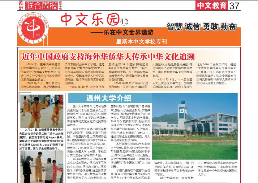 2009年我校成功举办的夏季海外华文教师培训班得到了海外华文教师的一致好评,他们回到欧洲后非常热衷于向广大华侨华裔宣传我校。葡萄牙里斯本中文学校向《欧洲联合周报》大力推荐我校的优质教学资源,由欧洲时报、新民晚报和葡华报联合出版的《欧洲联合周报》葡萄牙版在4月下旬的中文教育版对我校进行了大篇幅报道。该报道详细介绍了温州大学的办学历史、总体情况和办学理念,并着重介绍了我校的国际化发展情况和留学生教育,并配以图书馆的精美照片,青山绿水映衬下的温州大学透着书香墨韵,让人向往。