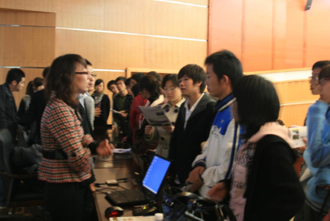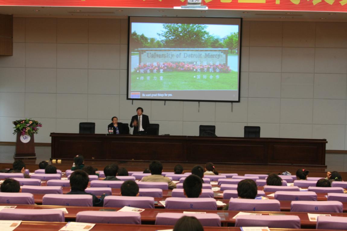 2009年11月16日下午在茶山高教园区温州大学图书馆二楼报告厅举行了别开生面的留学美国说明会。院长严晓鹏,党委书记方建敏,副院长陈军,对外项目办主任包含丽,美国底特律大学招生主管Louis Lin博士等出席了说明会。说明会由院长严晓鹏主持 。130多名来自温州大学各学院的同学参加了说明会。此次说明会重点向温大在校生推荐优质美国留学资源,为温大学子搭建低成本高效便捷的就读美国本硕课程的平台。