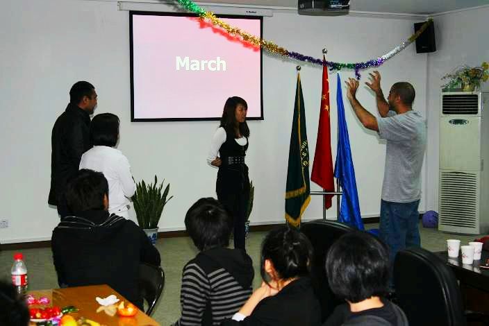 今天正好是感恩节,所以本次的主题就定为“Thanksgiving in my heart”,即“感恩在我心”,汤烈、林立、张泽三名同学为大家详细介绍了感恩节的相关知识,让同学们对西方文化有了更深入的了解。在英文版的“心灵相通”游戏中,张雪萍老师和留学生LENTZ配合最为默契,用最短的时间猜出了所有英文单词。接下来的“击鼓传花”和“抢椅子”游戏中,中奖者分别表演了各种节目。值得一提的是,国际交流坊指导老师徐海莺的儿子也参于其中,并请大哥哥们一起表演了英文儿歌,在小朋友的带动下,现场的气氛到达了高潮,欢笑声此起彼伏。