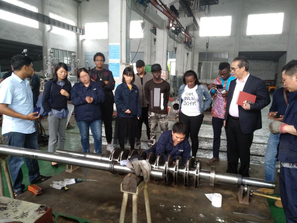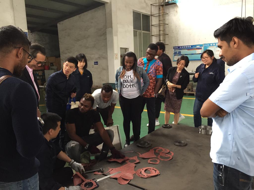 李作俊带领学院师生一行参观了工厂车间,并一一介绍了泵的铸造、加工及装配等工序。学生们兴致盎然、细心参观。机械工程专业的学生们认真观察、仔细研究了泵芯安装和不同成品,将所学专业知识联系到实践中,不时地向在场师傅提问。来自几内亚的GUILAVOGUI ELIE AKOYE甚至直接上手跟师傅学做零部件,体验泵的制造工艺。