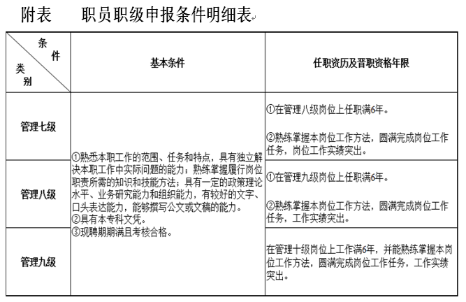 1.管理职员评聘的申报对象:现聘管理岗位的工作人员。本次管理岗位职员制的试点工作,仅针对管理岗位职级的九级、八级和七级进行。