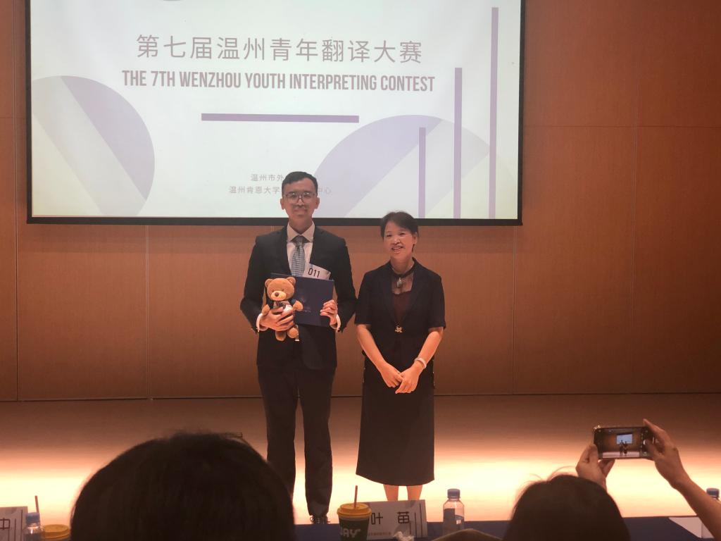 留学生辅导员老师钱江潮在决赛中最后一组上场,凭借娴熟的口译技能,最后荣获一等奖。本次青年翻译大赛分为初赛、复赛、决赛。全温州市约有200名来自各行各业的选手参加,既有大学生,也有来自温州市各高校的英语教师,能获得一等奖实属不易。