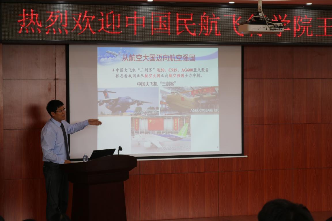 王教授在题为《助力“民航梦”•复兴“中国梦”》的演讲中,以中国大飞机“三剑客”——Y20、C919、AG600蓝天聚首为开场,进而说明我国要实现从航空大国到航空强国的跃升,离不开通航产业发展的原因。王教授在报告中,主要介绍了全球运输航空行业发展现状和前景预测,解读了我国从航空大国向航空强国全力冲刺的相关战略以及民航局的相关政策。