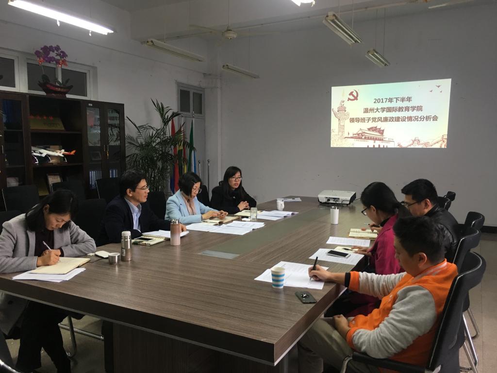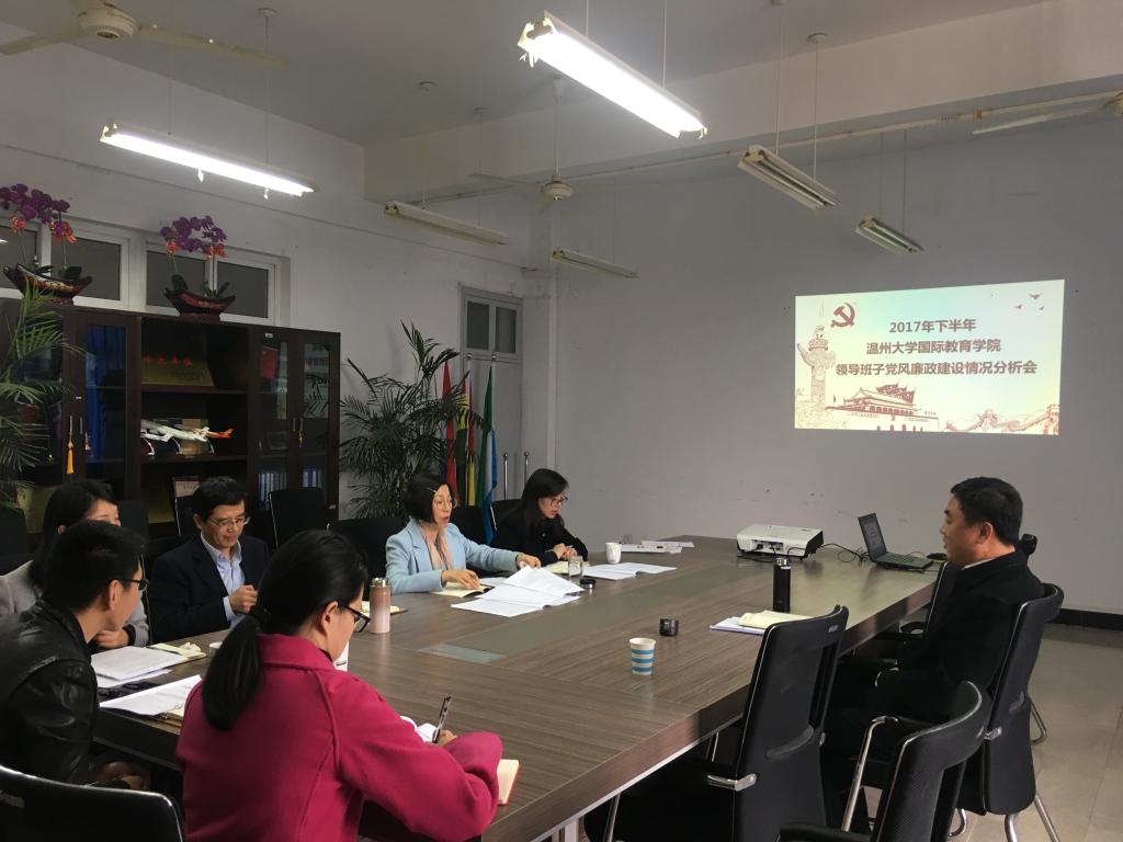会上,院长兼书记叶苗传达了学校《温州大学关于在二级单位实行领导班子党风廉政建设情况分析会制度的通知》(温大党委〔2016〕50号)文件的精神,分析了这一年学院党风廉政建设情况和党员干部一岗双责、民主集中制、作风建设情况。学院领导班子成员结合自身工作,认真研究,排查了党风廉政建设工作风险点,针对存在的不足和问题,提出相应的整改措施和建议。