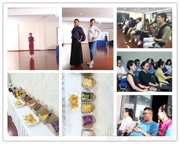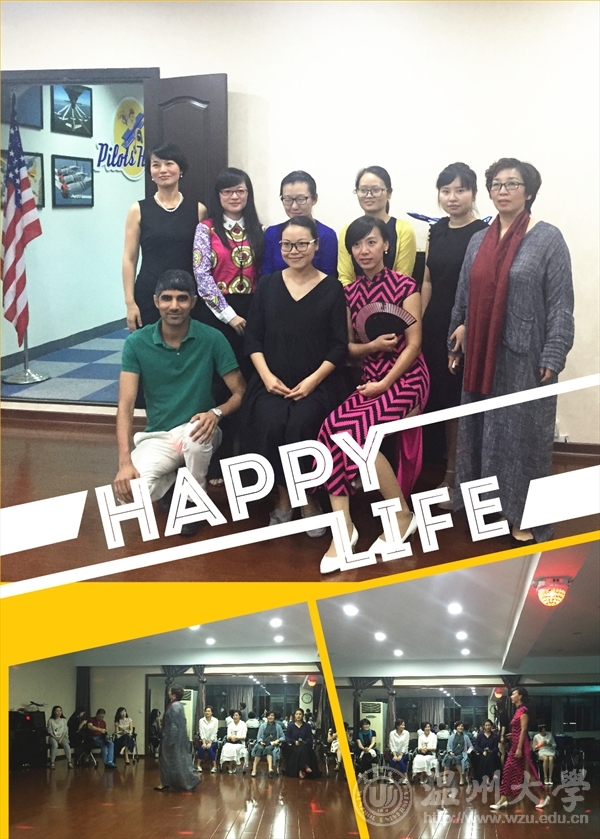 聚餐结束后,大家又前往学院路校区参加了精彩纷呈的沙龙活动,主要分为小型服装秀表演、服饰文化与礼仪presentation、互动环节、小型冷餐buffet四个部分。本期活动还邀请了温州30多名外语爱好者参加。学院工会主席包含丽副院长在沙龙活动伊始的致辞中表示,“温州是著名的侨乡,有着丰富的国际化资源,我们将欧美Language lover club的理念引进来,利用温州大学国际合作学院自身的国际化资源优势,让众多留学生和外教参与进来,给温州市外语爱好者创造良好的外语文化环境,使地处温州市中心的飞行学院成为温州市的多元文化娱乐交流中心,大家可以在这里结交世界各地的朋友,同时练习各国语言,找到自己的语言伴侣,提升温州市民文化品质。”现场气氛热烈,学院教工和来宾们就主题为unique clothes纷纷表达了自己的看法和观点,有的说“every cloth has its soul(每件衣服都有自己的灵魂)”,有的说“clothes represent a person’s character and personality(衣服代表了人的个性和性格)”····