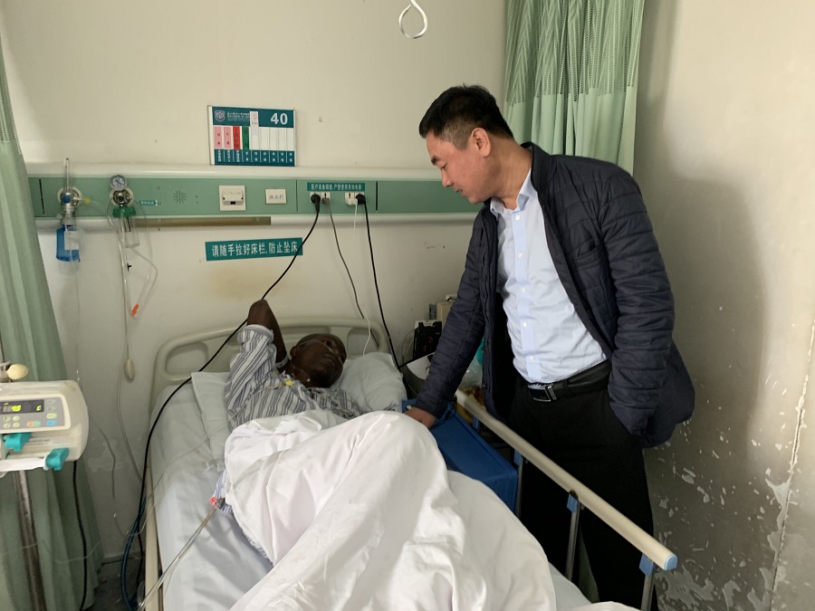 钱强首先和主治医生进行了沟通,详细询问了该生的病情和发病原因,对其康复疗程、康复时间和后续影响等作了深入了解。结合医生的意见和建议,钱强对该生传达了医生的治疗建议和注意事项,鼓励他相信医院的医疗实力,努力做好康复训练。同时,为了表达学校对困难留学生的关心,亲手将5000元人民币的助学基金交给学生。随后,林爱菊和张雪萍与学生讲解了饮食和生活习惯注意事项,宽慰他放松心情,安心修养治疗,并祝愿他早日康复、返校学习。在学校和学院的关心下,该生表示非常感谢学校在他困难的时候伸出援手,给他经济和精神上的支持。